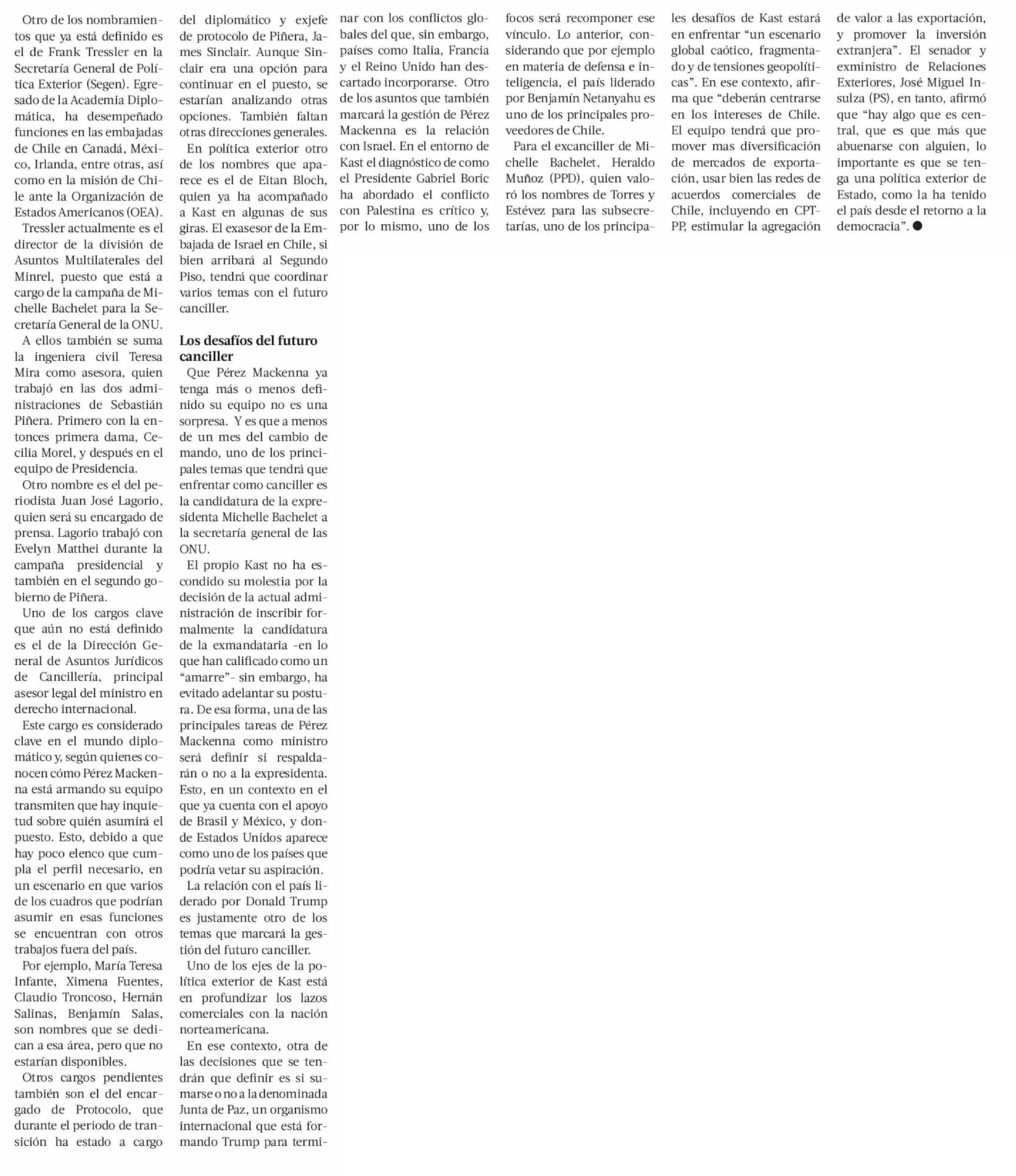 El equipo que arma Pérez Mackenna para su Cancillería y la ronda de reuniones para preparar su aterrizaje