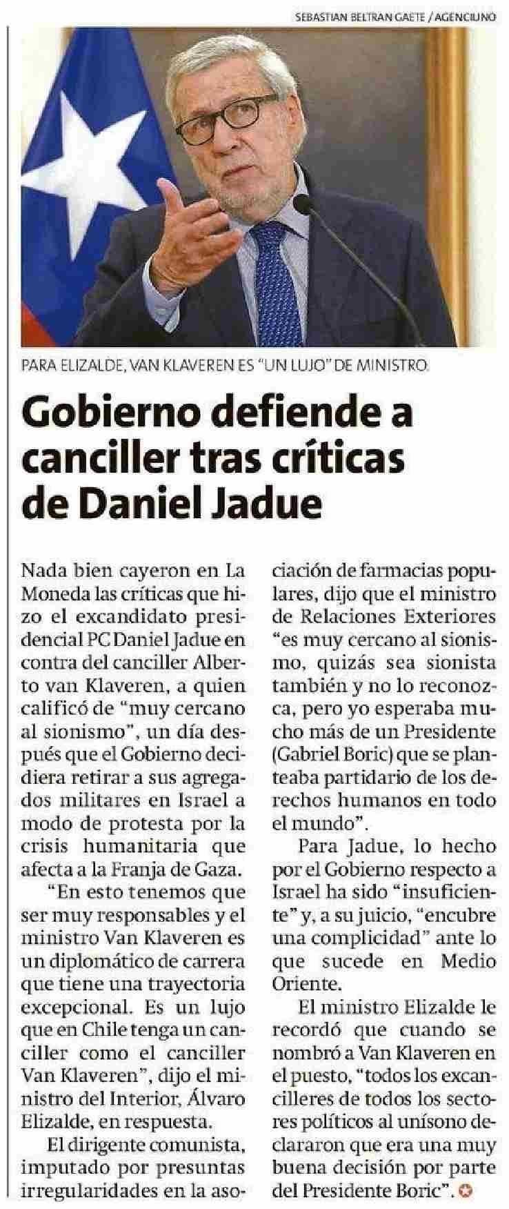 Gobierno defiende a canciller tras críticas de Daniel Jadue de Daniel Jadue