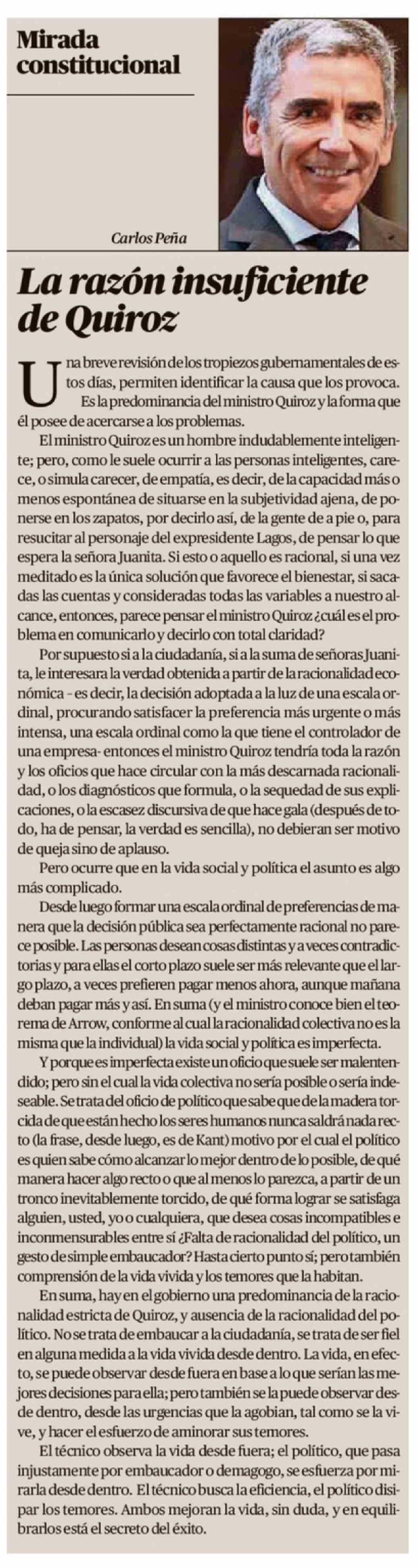 Columnas de Opinión: La razón insuficiente de Quiroz