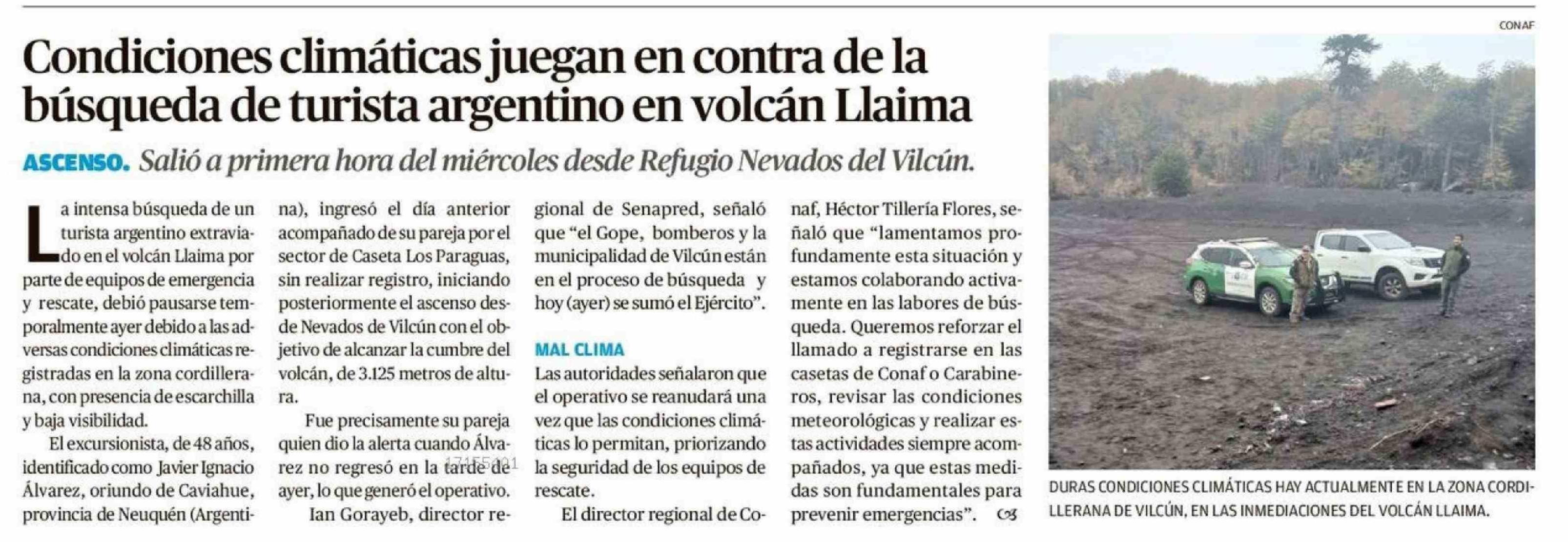 Condiciones climáticas juegan en contra de la búsqueda de turista argentino en volcán Llaima