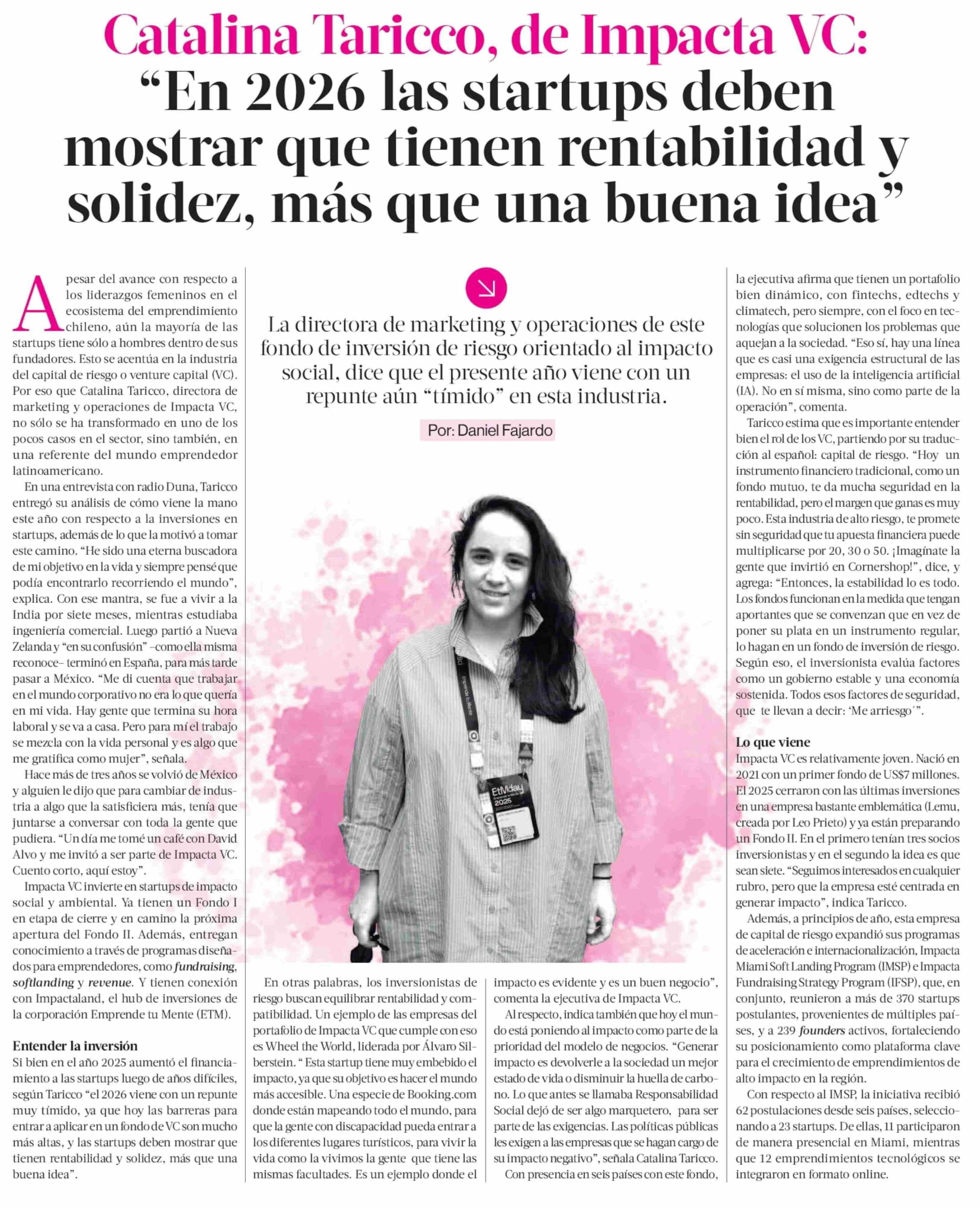 Catalina Taricco, de Impacta VC: "En 2026 las startups deben mostrar que tienen rentabilidad y solidez, más que una buena idea"