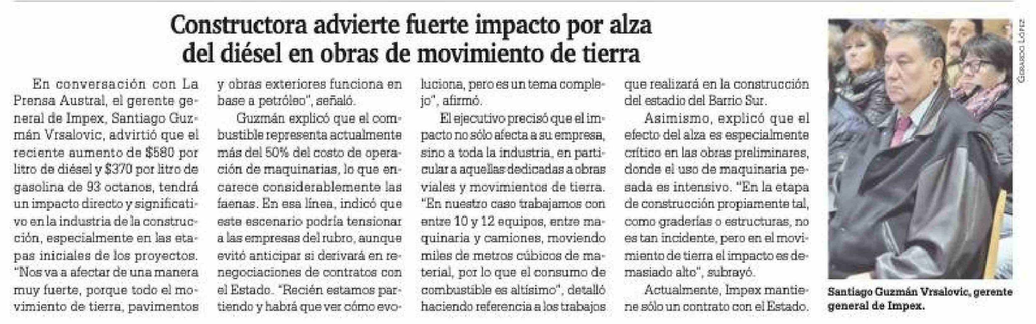 Constructora advierte fuerte impacto por alza del diésel en obras de movimiento de tierra