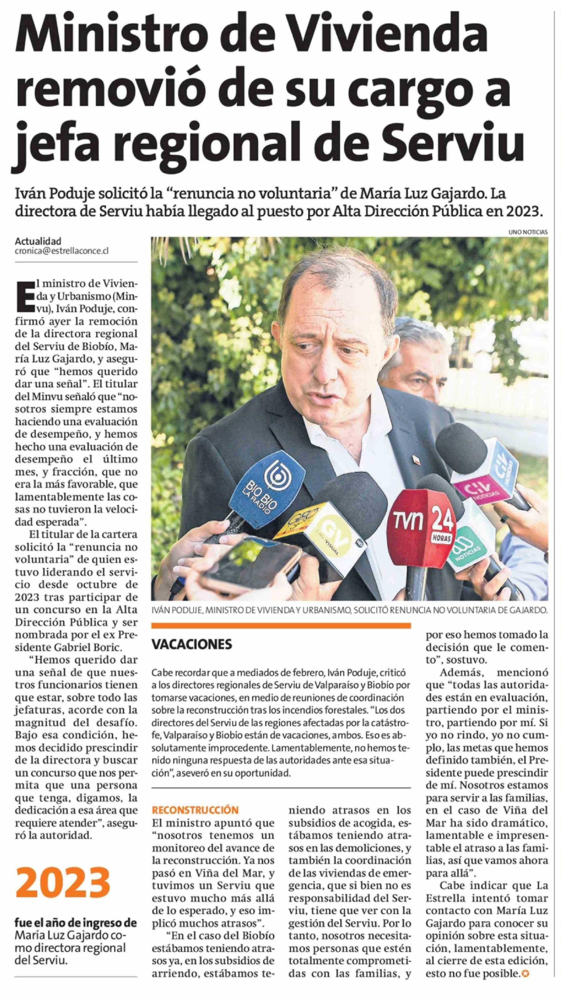 Título: Ministro de Vivienda removió de su cargo a jefa regional de Serviu