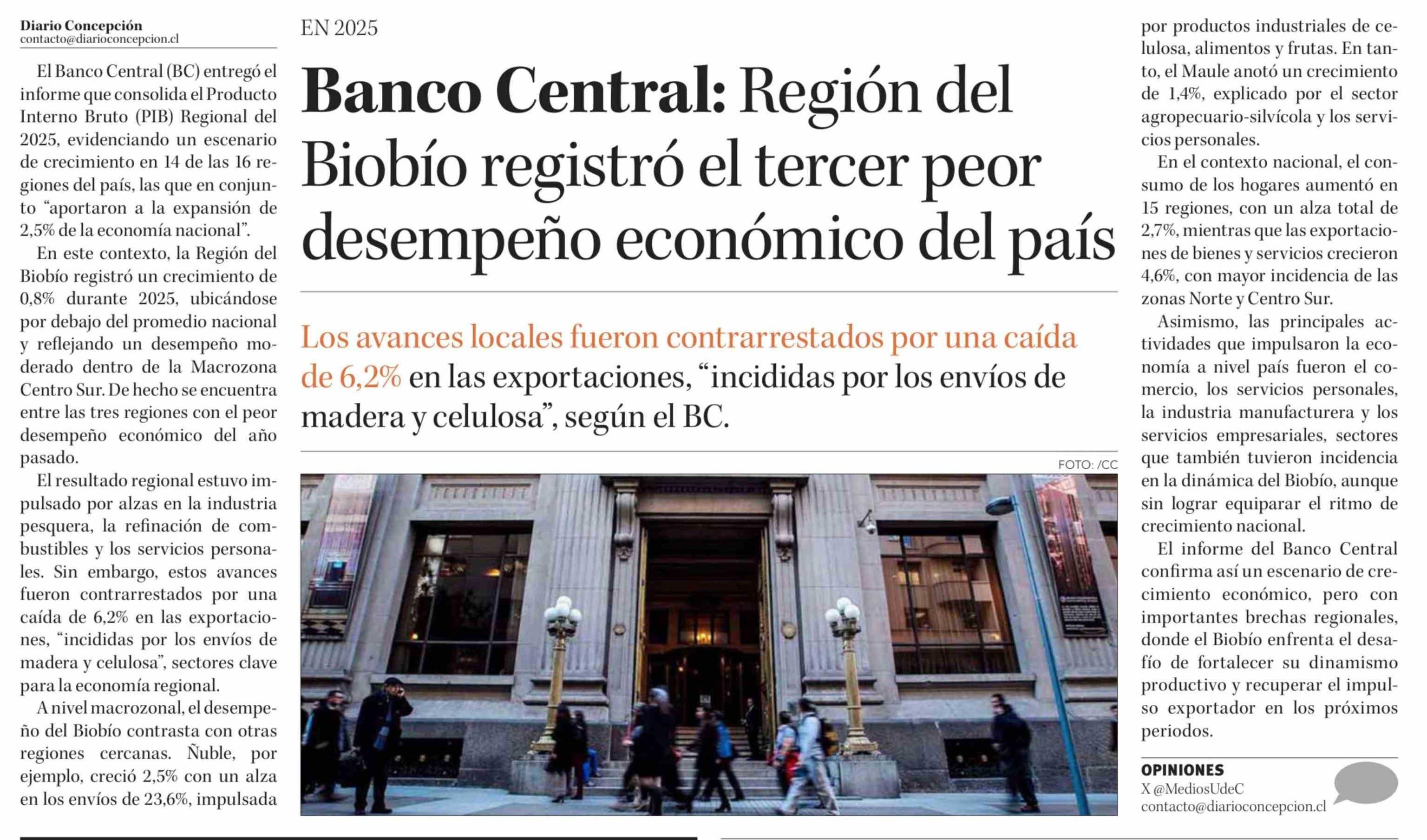 Banco Central: Región del Biobío registró el tercer peor desempeño económico del país