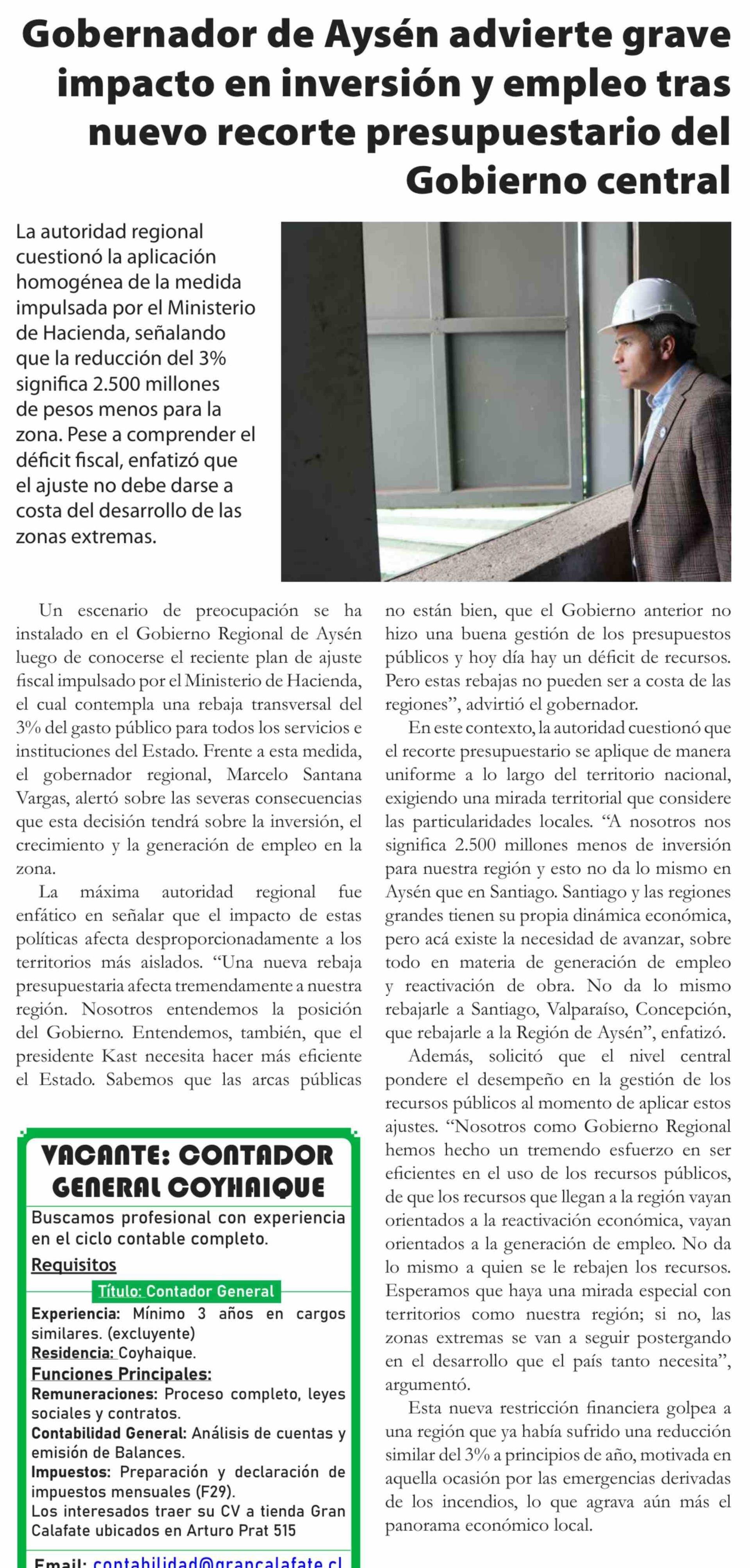 Gobernador de Aysén advierte grave impacto en inversión y empleo tras nuevo recorte presupuestario del Gobierno central