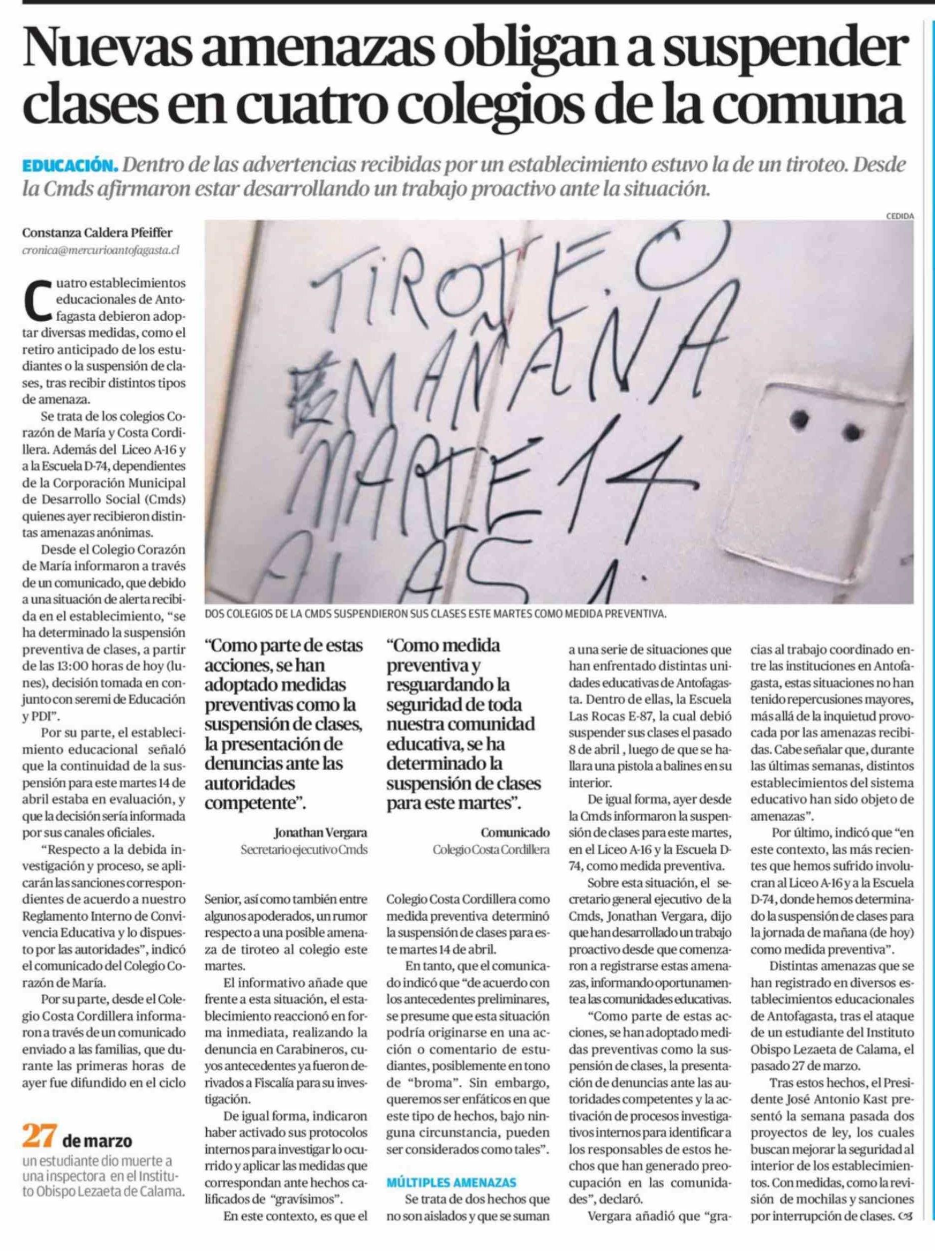 Nuevas amenazas obligan a suspender clases en cuatro colegios de la comuna