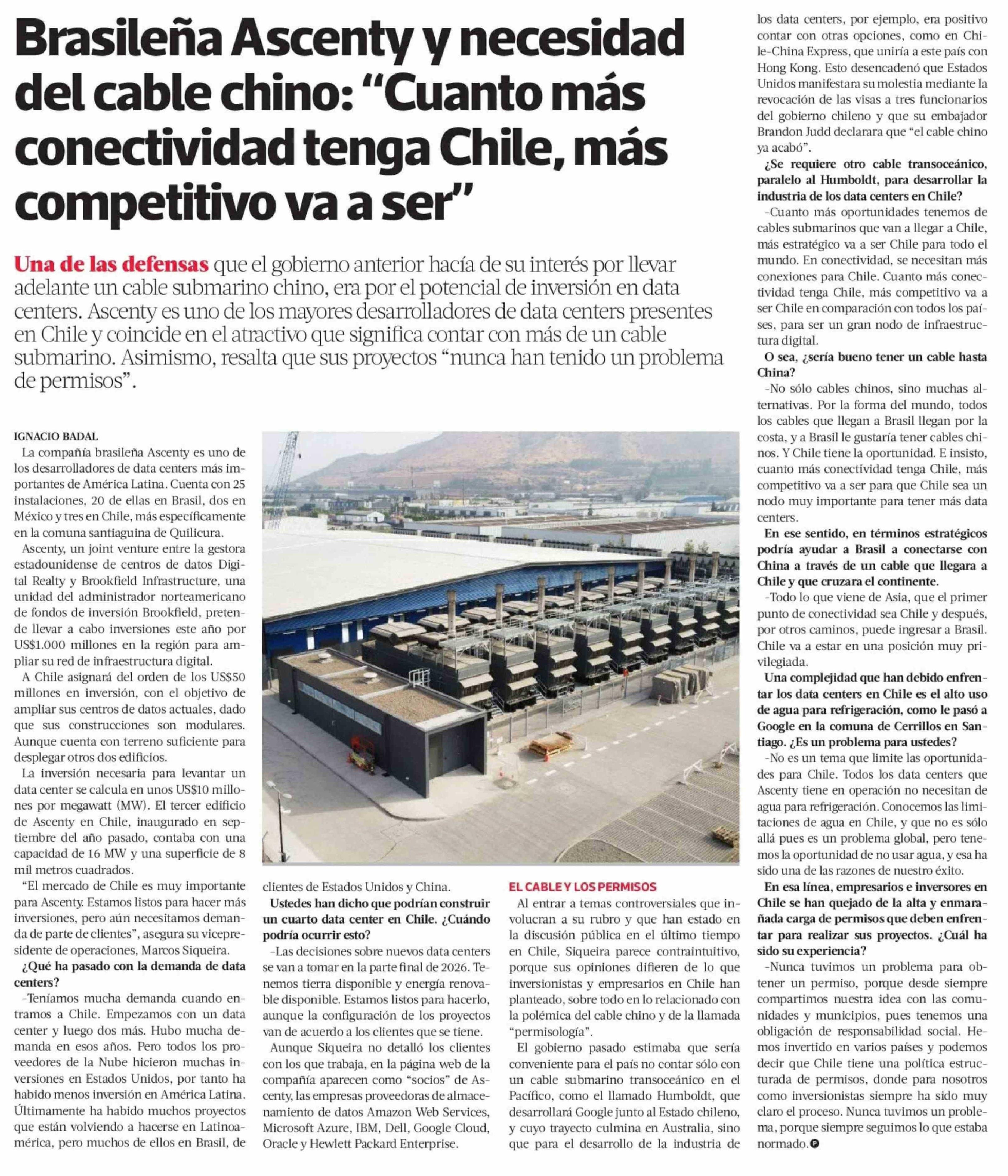 Brasileña Ascenty y necesidad del cable chino: "Cuanto más conectividad tenga Chile, más competitivo va a ser"