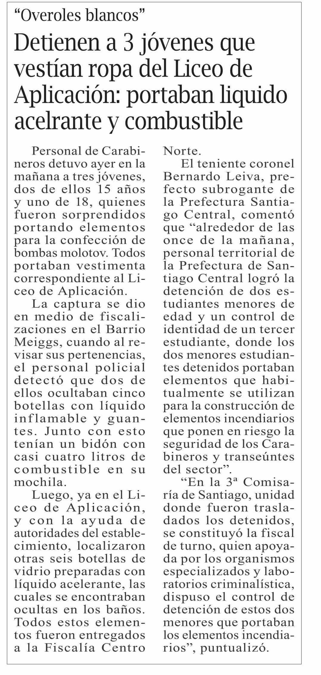 Detienen a 3 jóvenes que vestían ropa del Liceo de Aplicación: portaban liquido aceirante y combustible