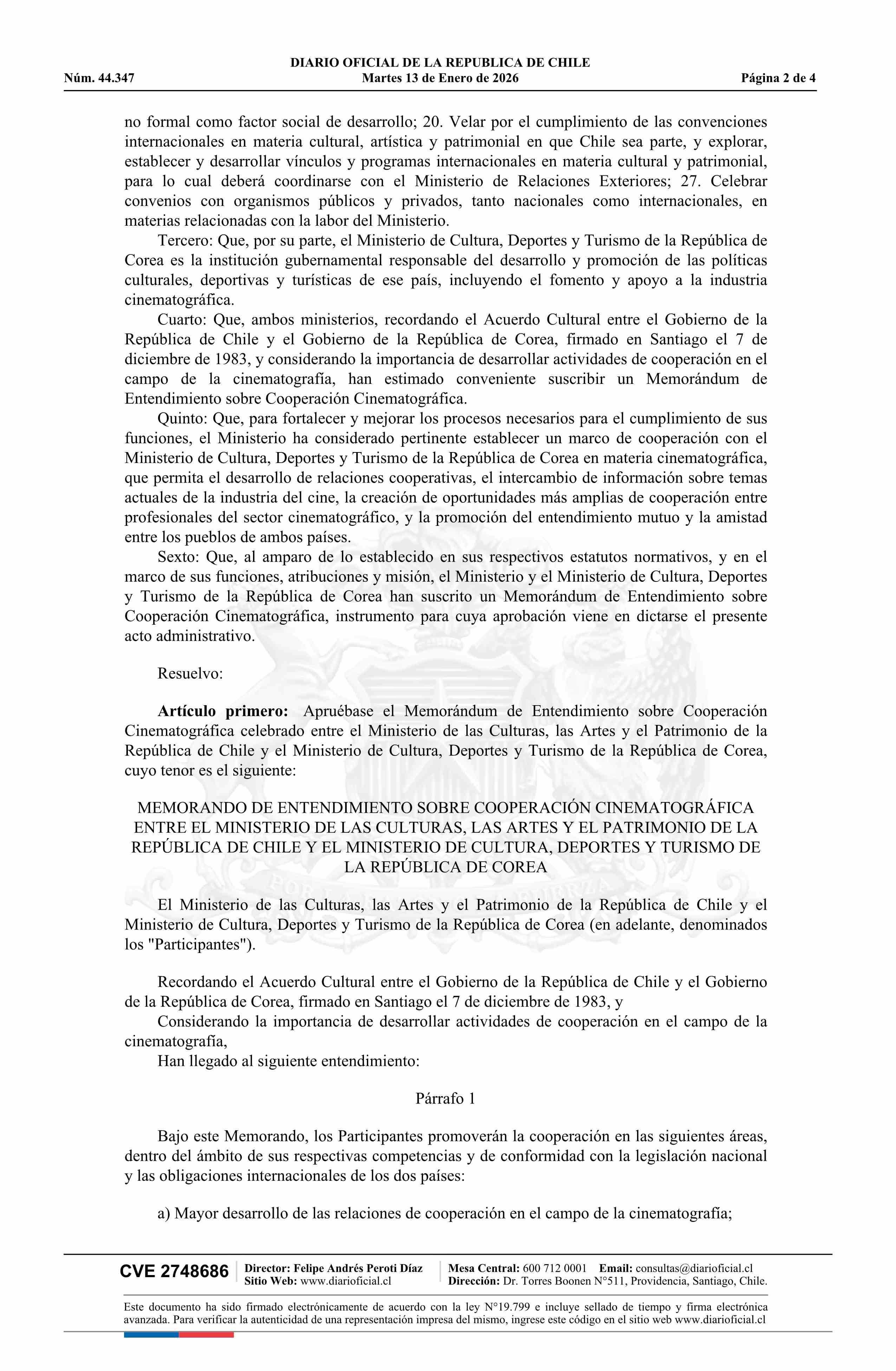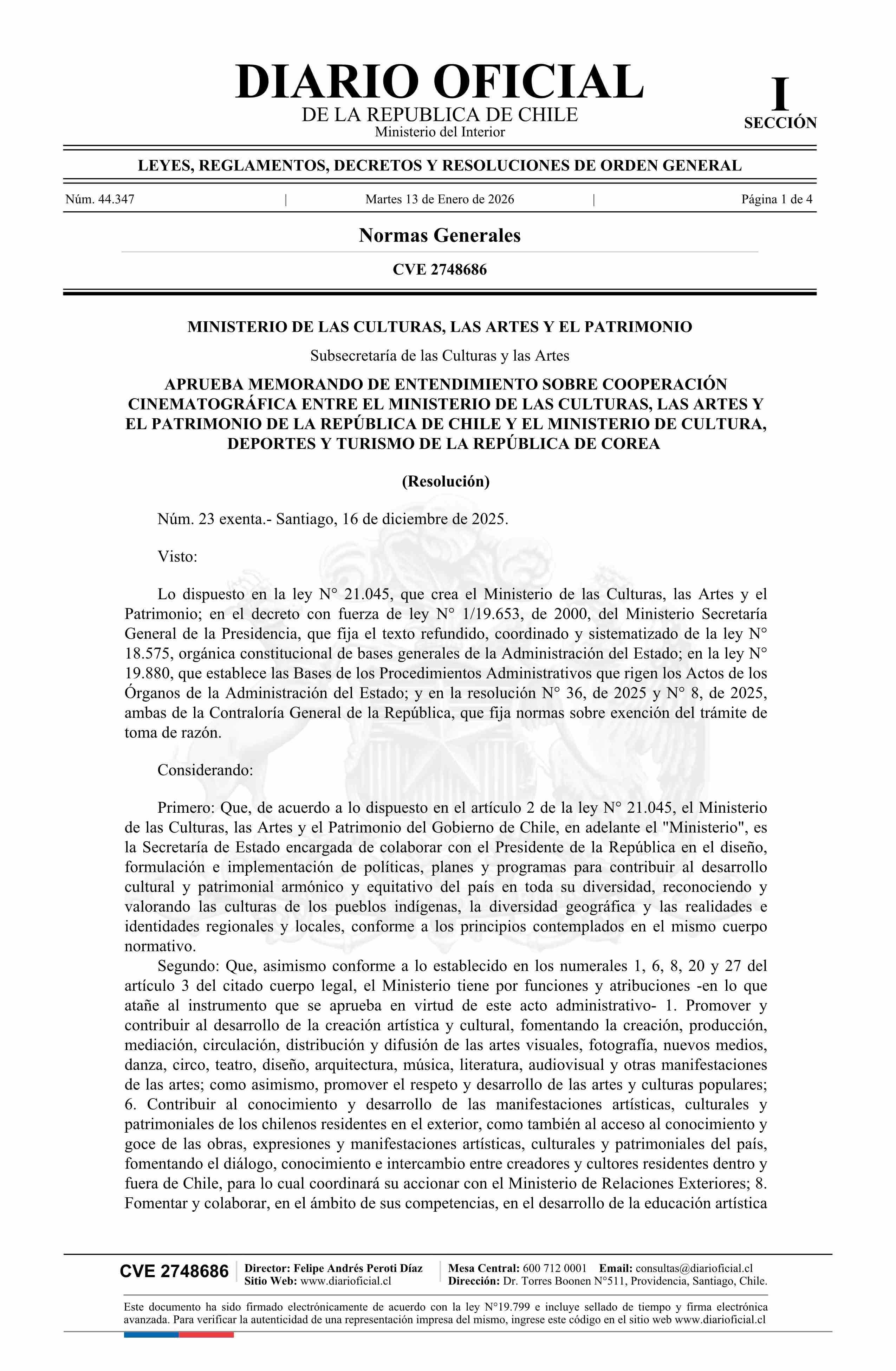 | Título: | Resolución exenta número 23, de 2025.- Aprueba Memorando de Entendimiento sobre Cooperación Cinematográfica entre el Ministerio de las Culturas, las Artes y el Patrimonio de la República de Chile y el Ministerio de Cultura, Deportes y Turismo de la República de Corea |