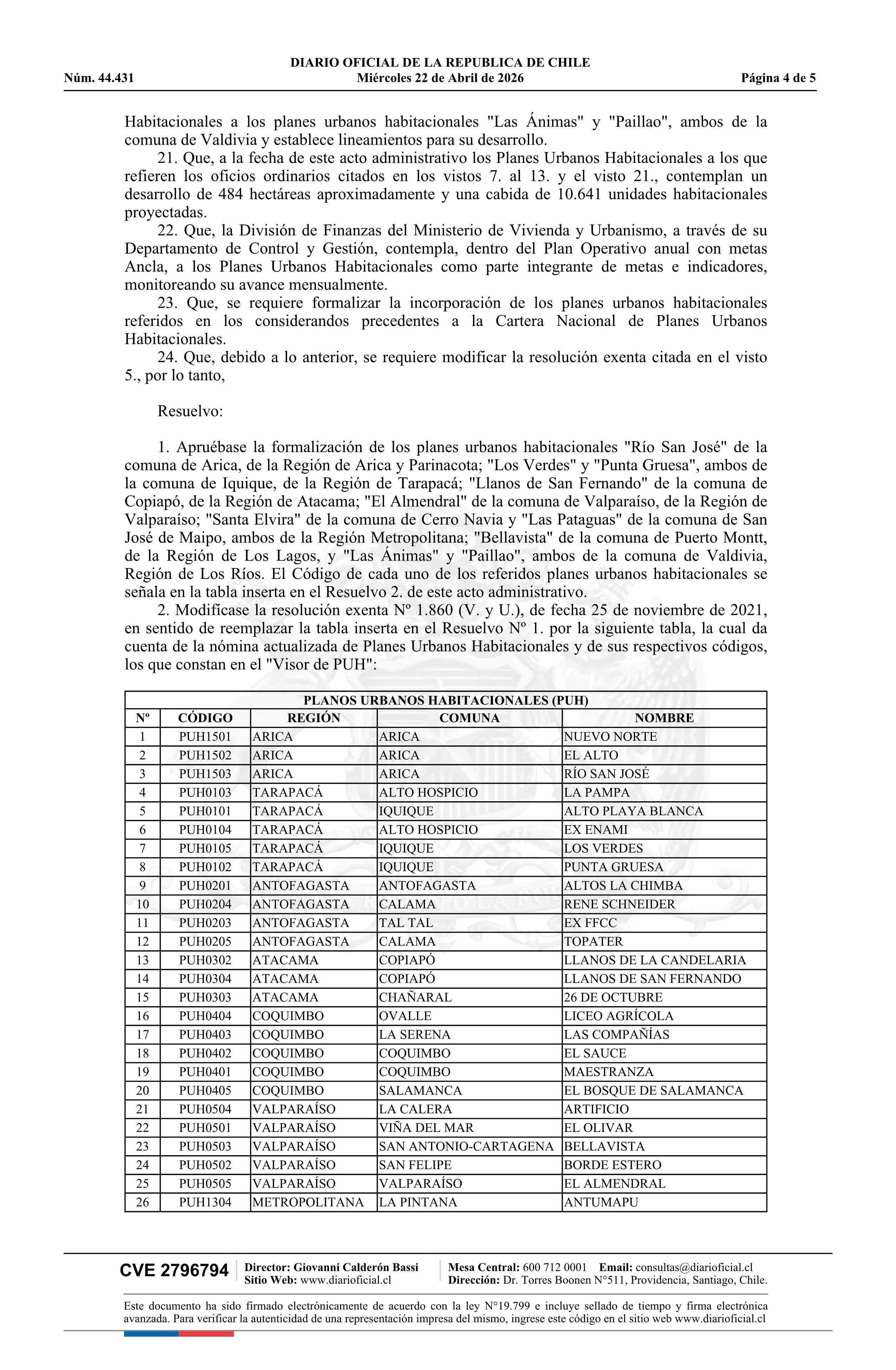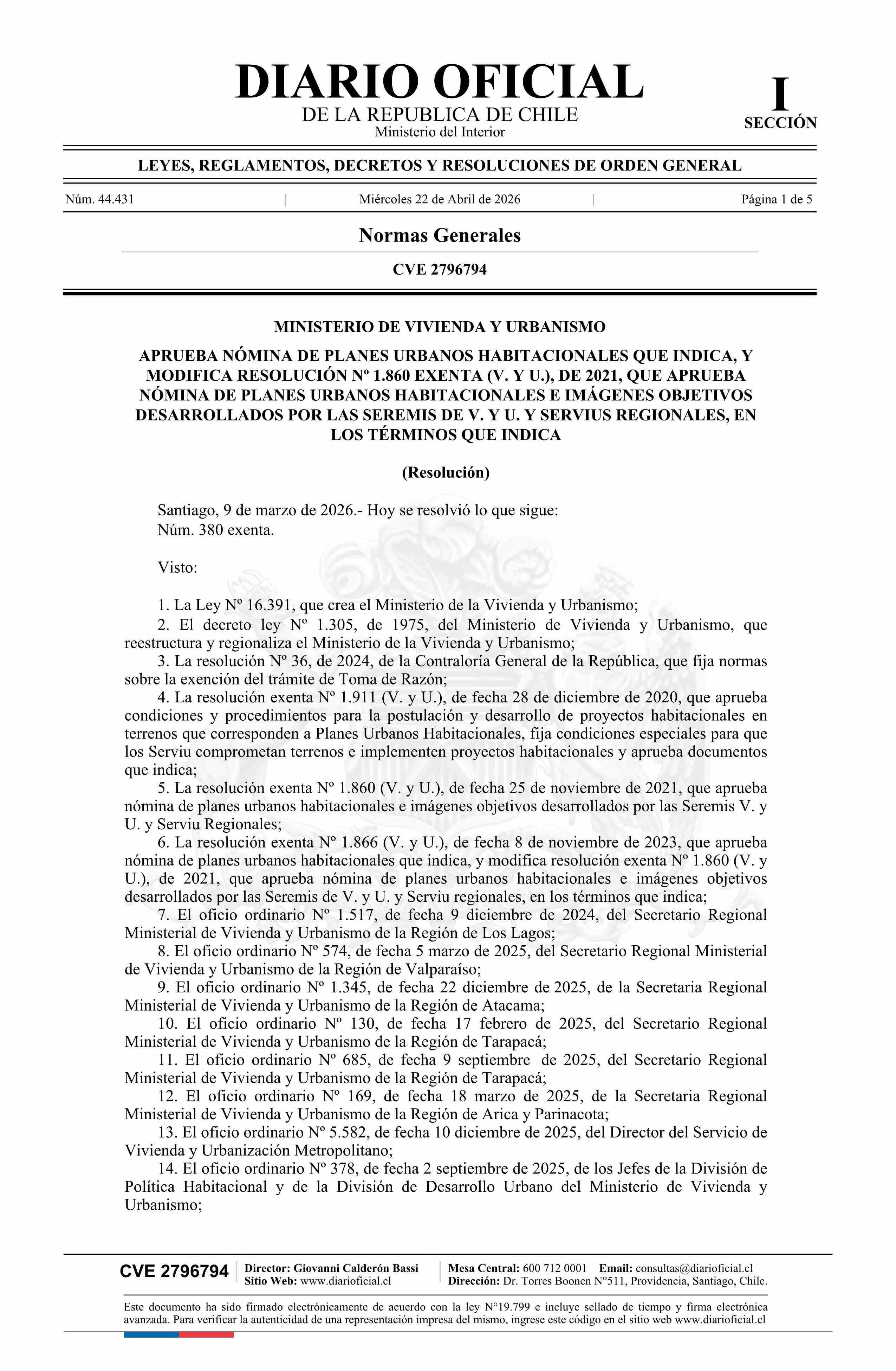 | Título: | Resolución exenta número 380, de 2026.- Aprueba nómina de planes urbanos habitacionales que indica y modifica resolución Nº 1.860 exenta, de 2021, que aprueba nómina de planes urbanos habitacionales e imágenes objetivos desarrollados por las Secretarías Regionales Ministeriales de Vivienda y Urbanis |