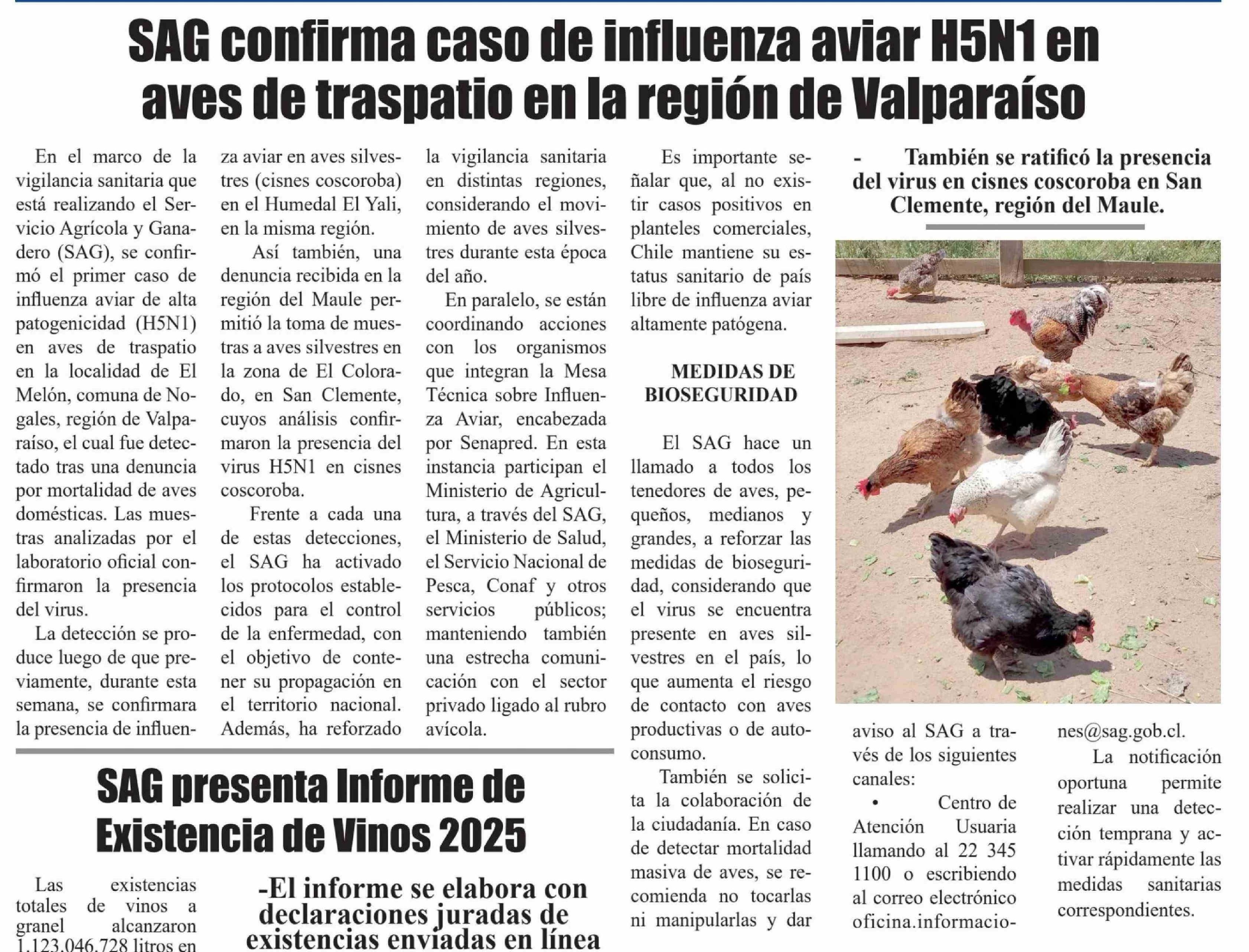 SAG confirma caso de influenza aviar H5N1 en aves de traspatio en la región de Valparaíso