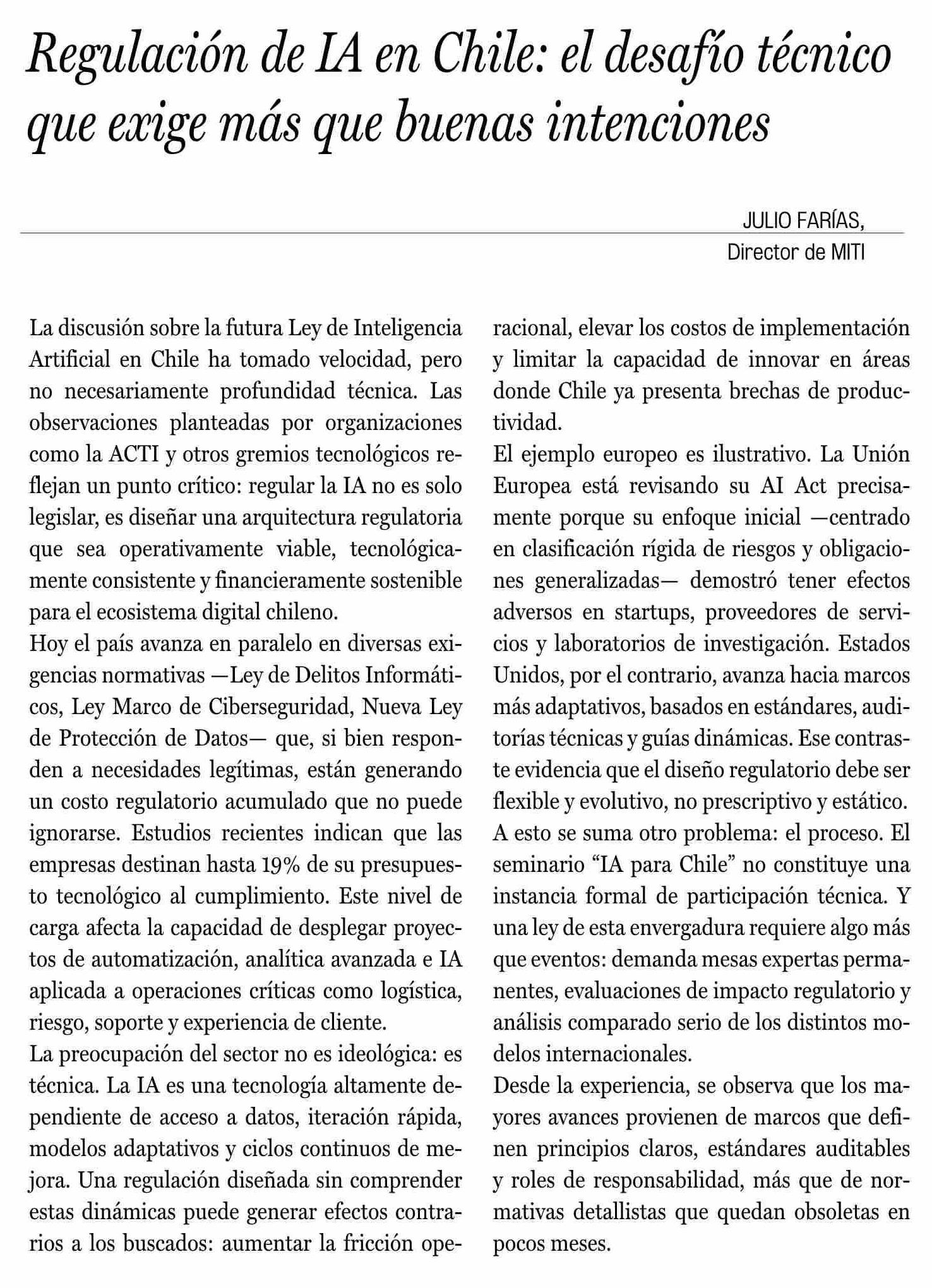 Columnas de Opinión: Regulación de IA en Chile: el desafío técnico que exige más que buenas intenciones