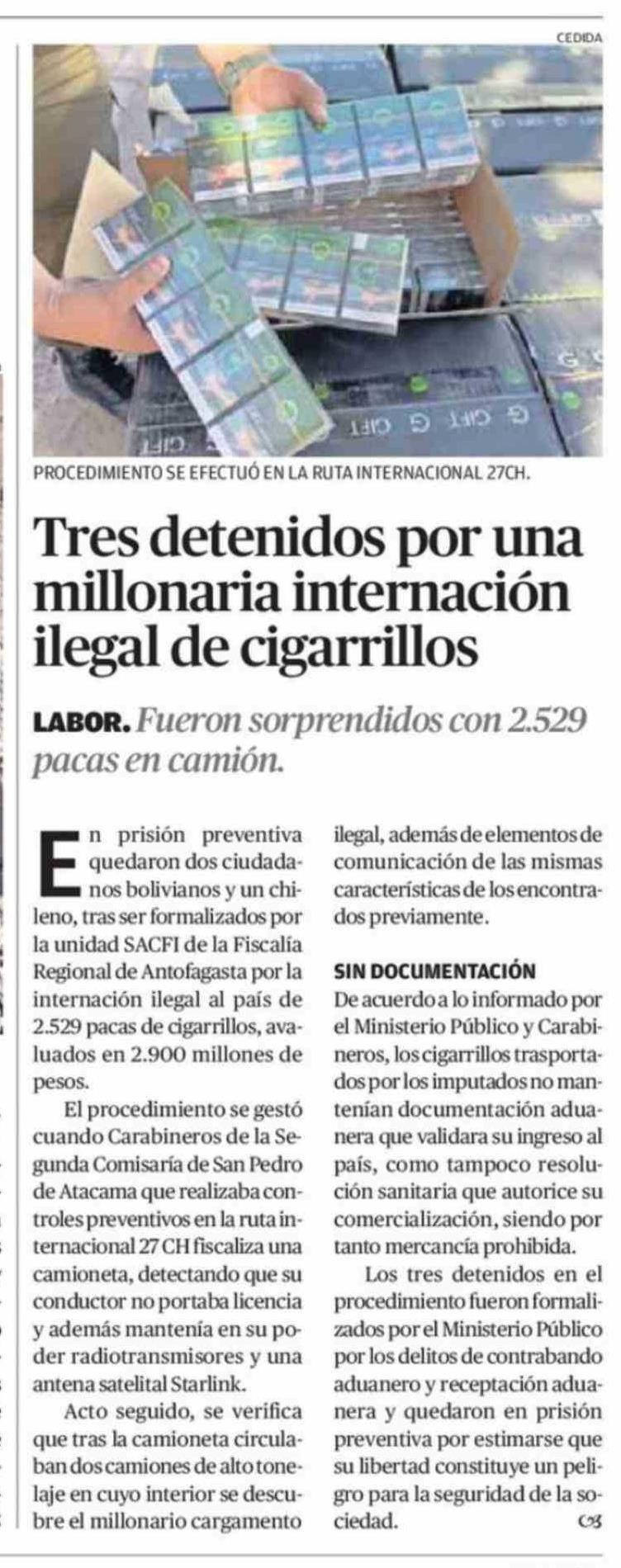 Tres detenidos por una millonaria internación ilegal de cigarrillos