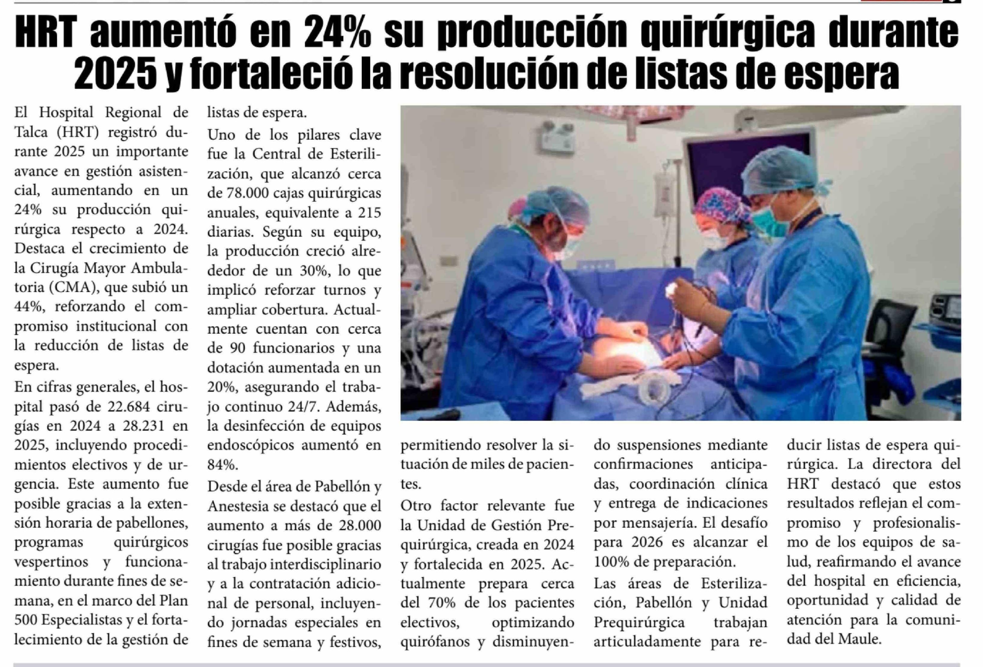 HRT aumentó en 24% su producción quirúrgica durante 2025 y fortaleció la resolución de listas de espera