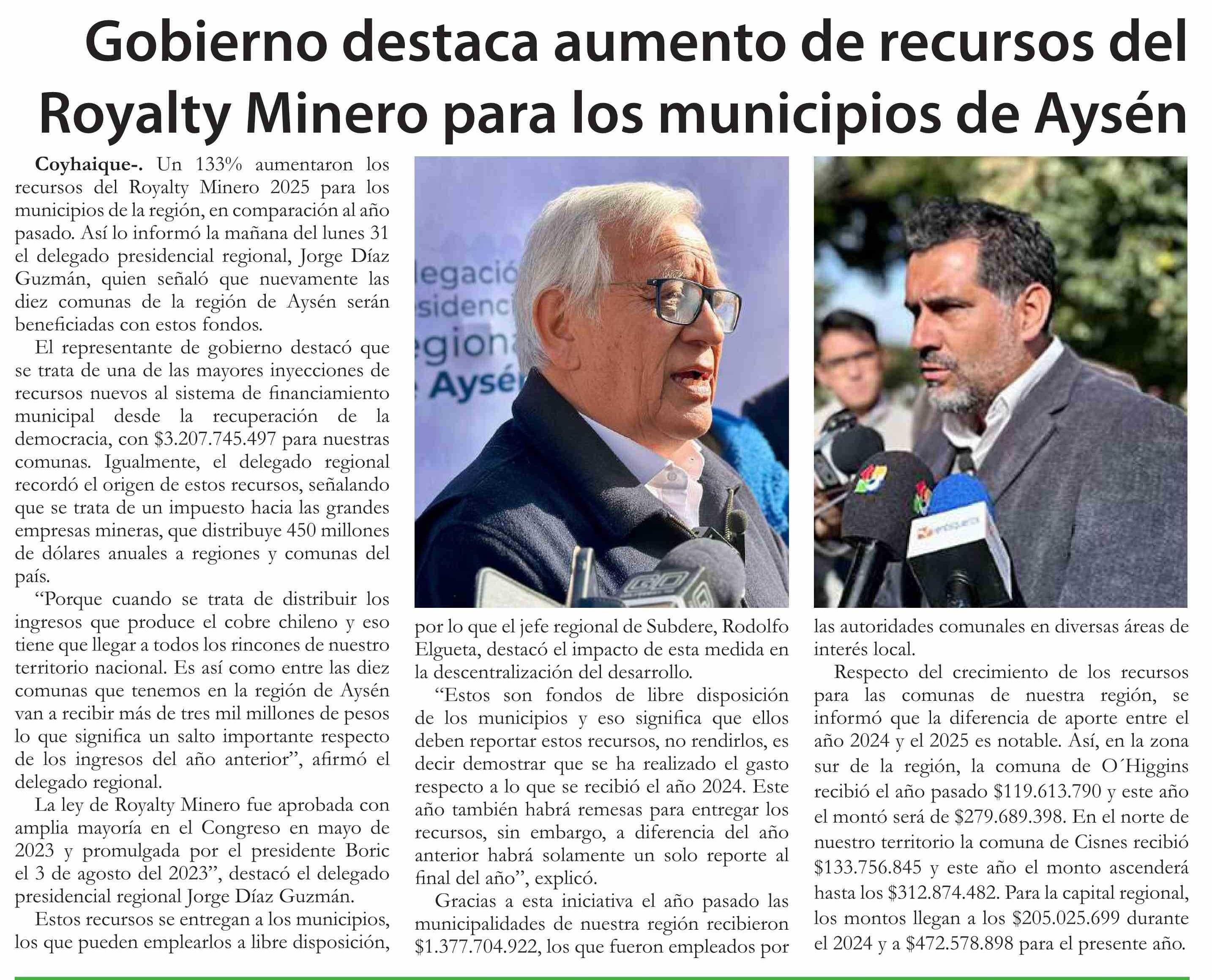 Gobierno destaca aumento de recursos del Royalty Minero para los municipios de Aysén