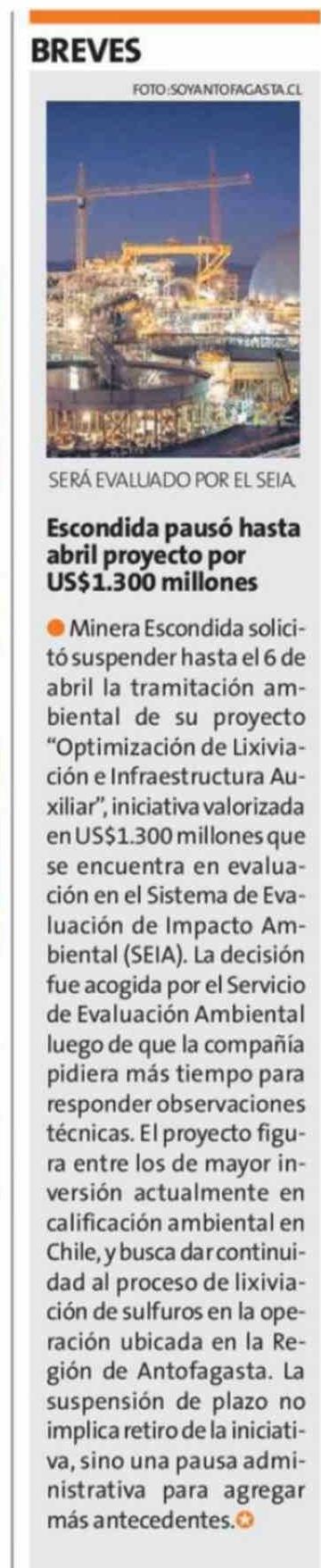 Escondida pausó hasta abril proyecto por US$1.300 millones