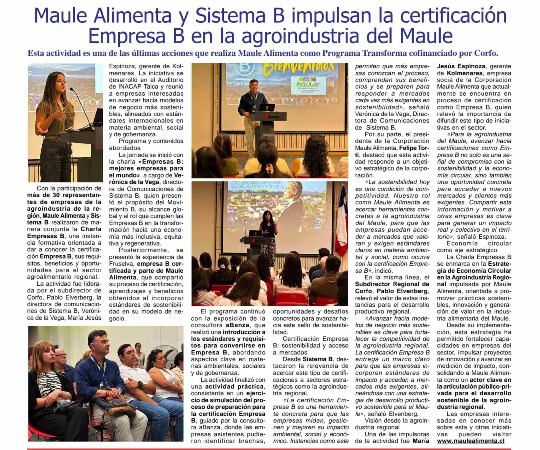 Maule Alimenta y Sistema B impulsan la certificación Empresa B en la agroindustria del Maule