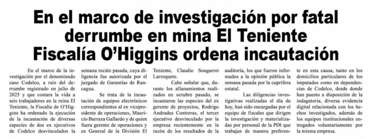 En el marco de investigación por fatal derrumbe en mina El Teniente Fiscalía O'Higgins ordena incautación