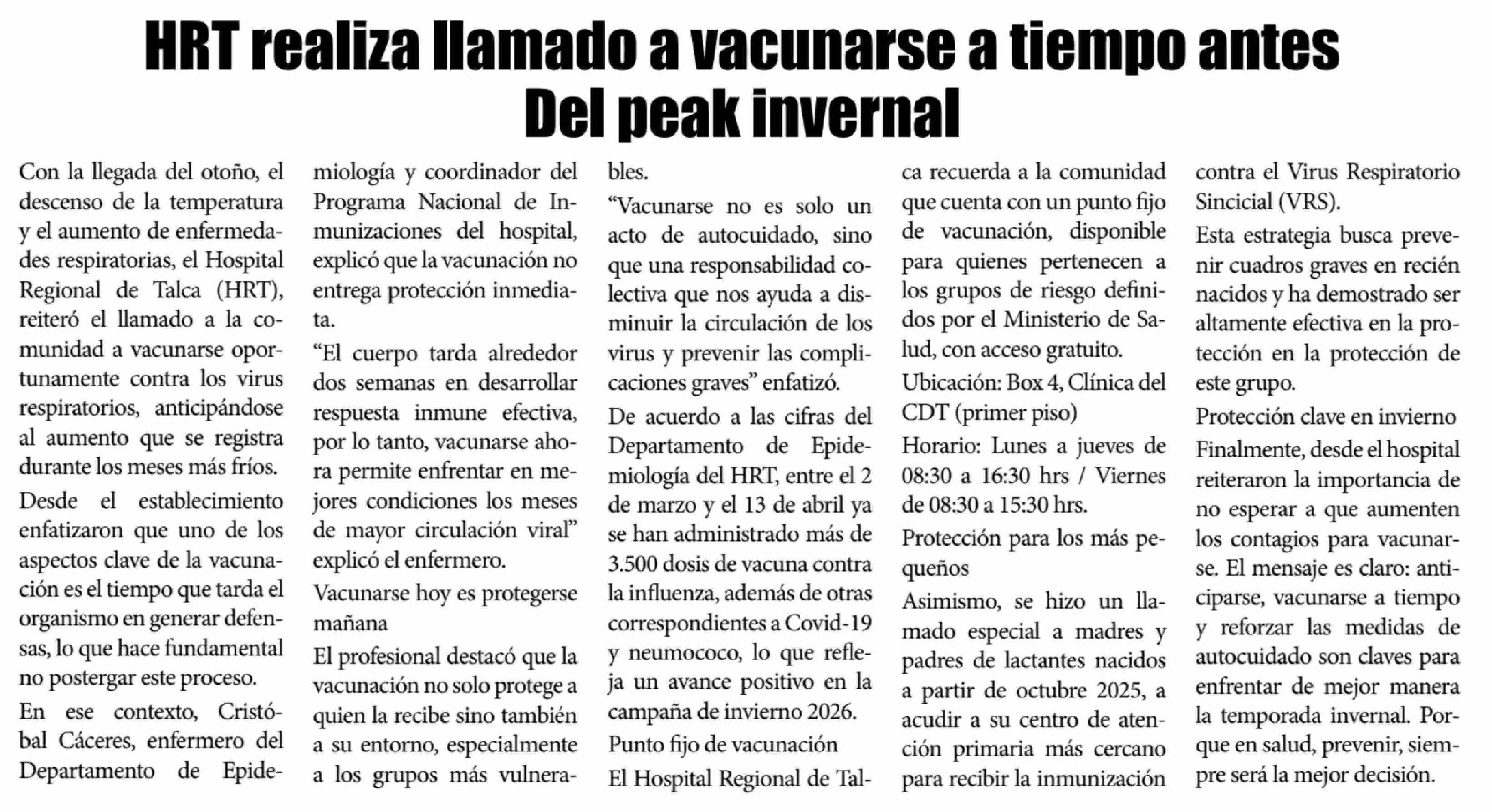 Título: HRT realiza llamado a vacunarse a tiempo antes Del peak invernal