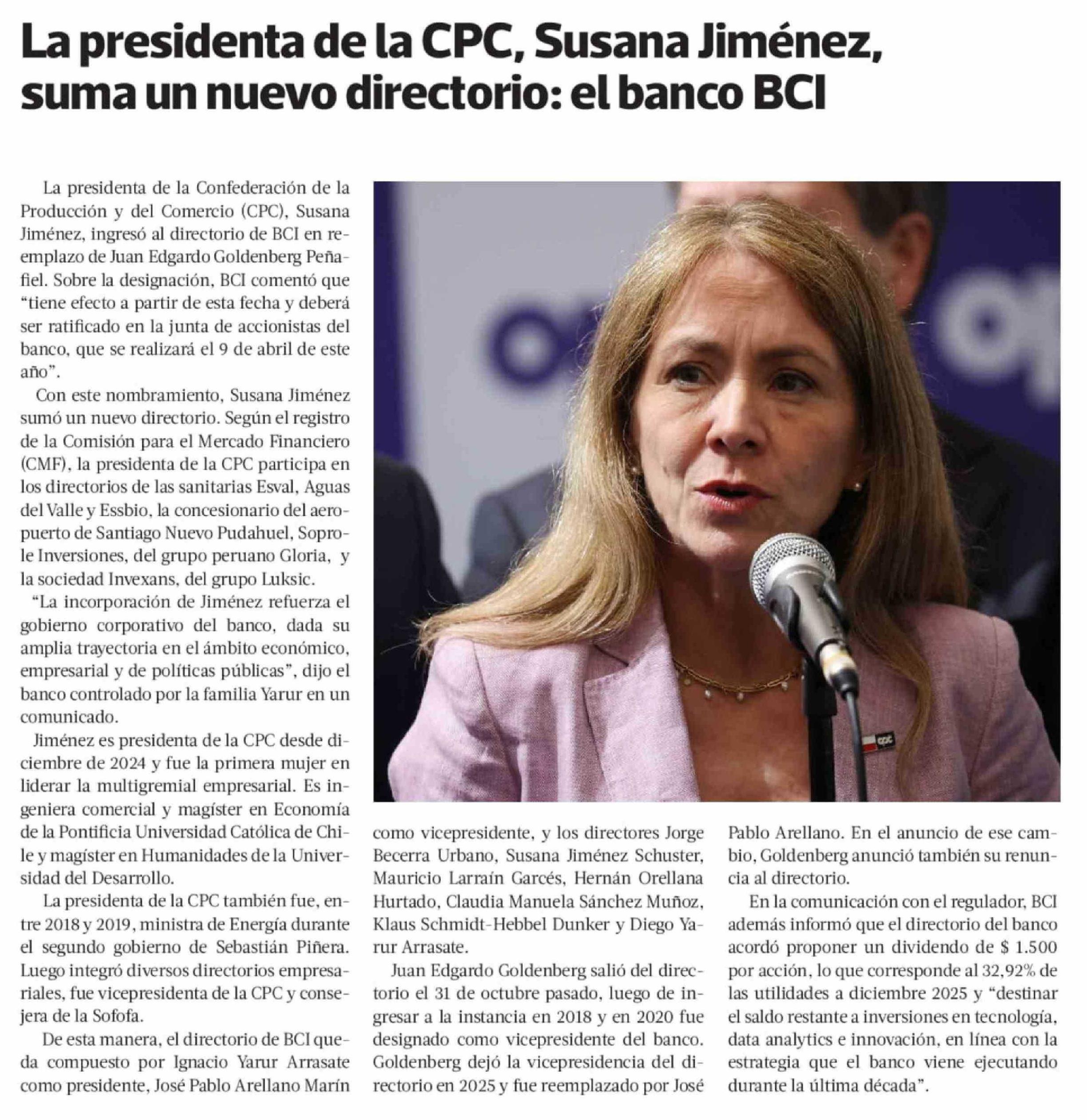 Título: La presidenta de la CPC, Susana Jiménez, suma un nuevo directorio: el banco BCI