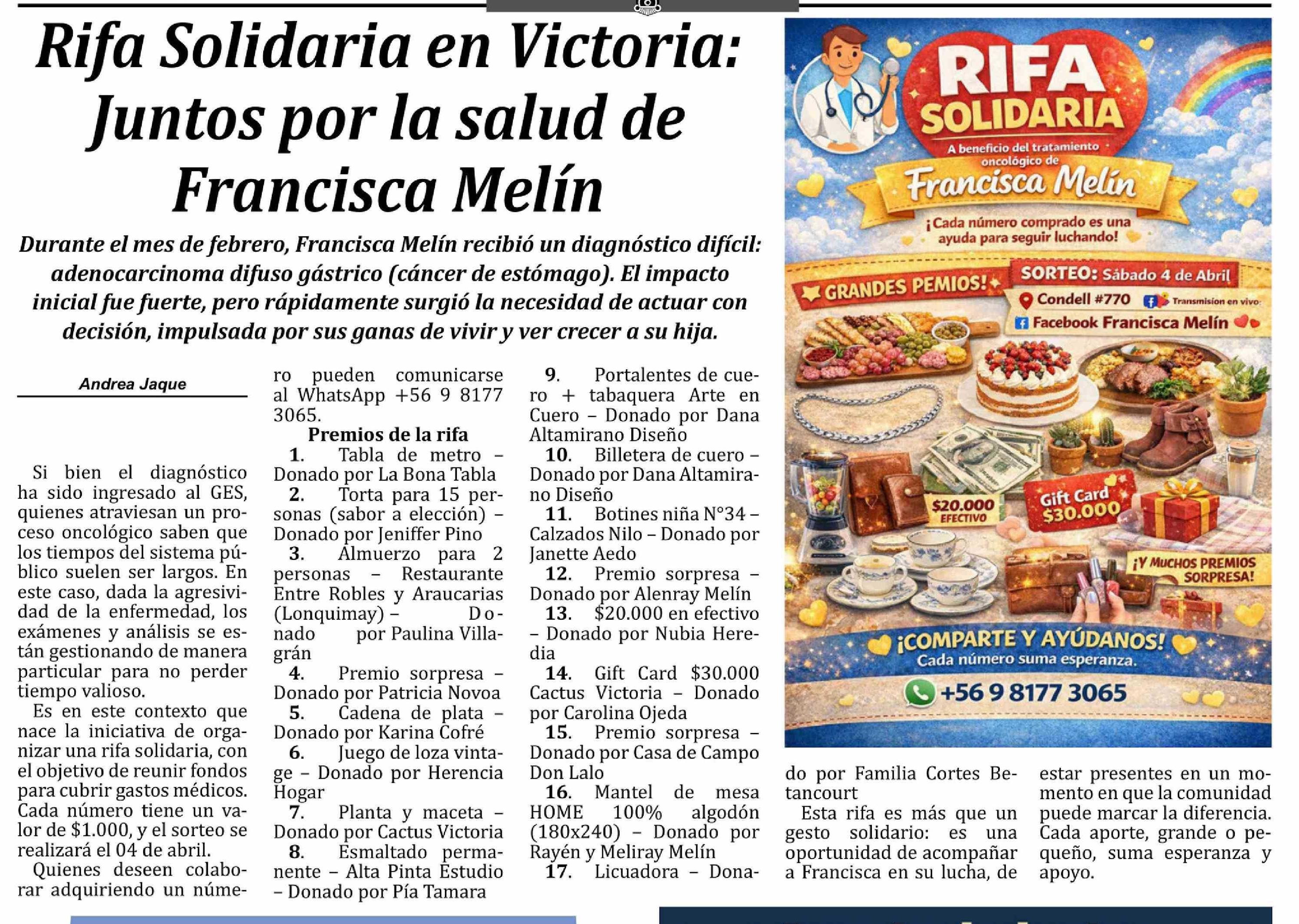 Rifa Solidaria en Victoria: Juntos por la salud de Francisca Melín
