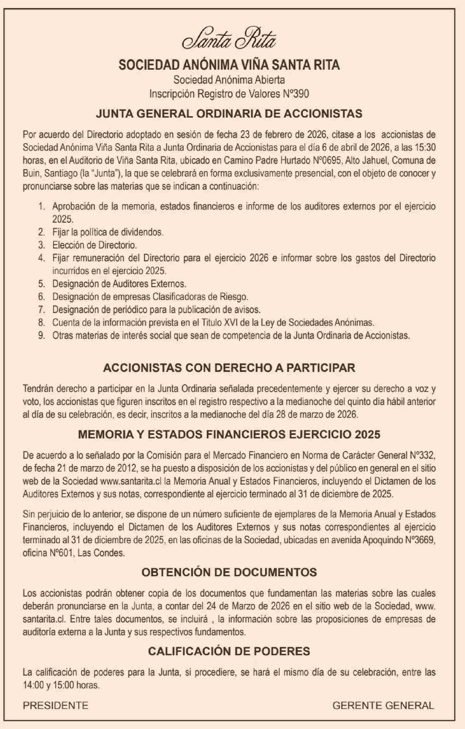 | Título: | SOCIEDAD ANÓNIMA VIÑA SANTA RITA Sociedad Anónima Abierta Inscripción Registro de Valores N*390 JUNTA GENERAL ORDINARIA DE ACCIONISTAS |
