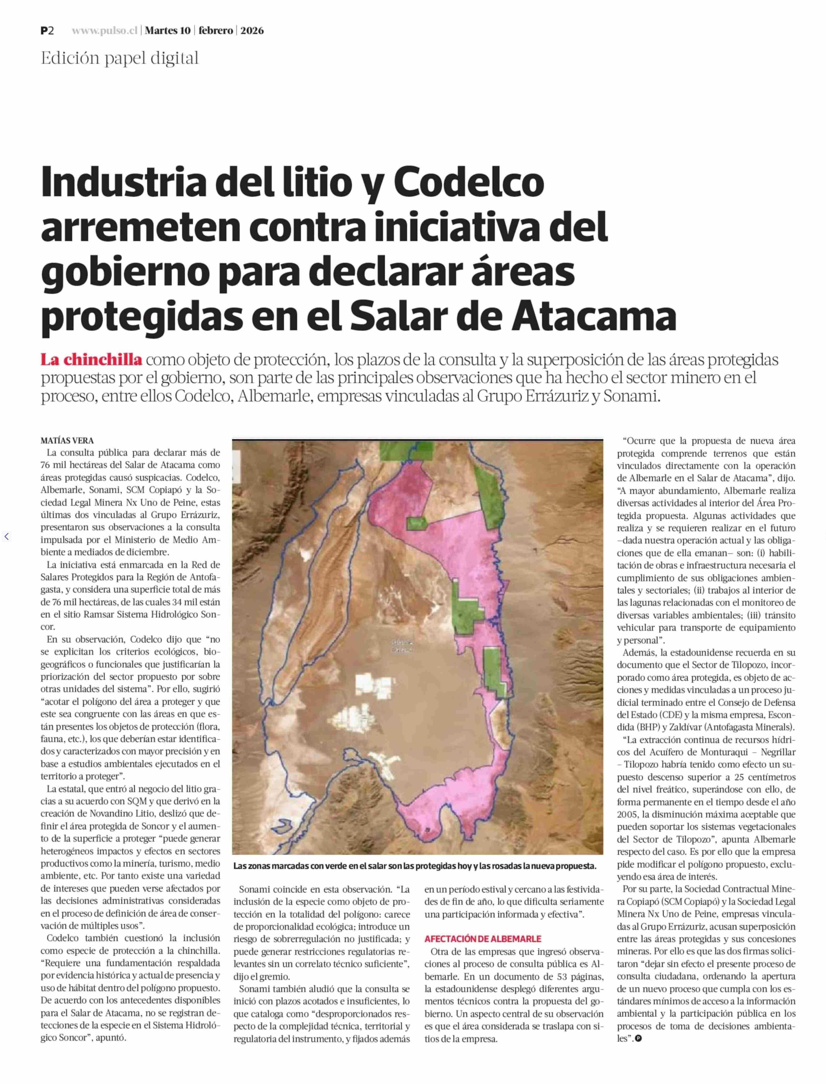 | Título: | Industria del litio y Codelco arremeten contra iniciativa del gobierno para declarar áreas protegidas en el Salar de Atacama |