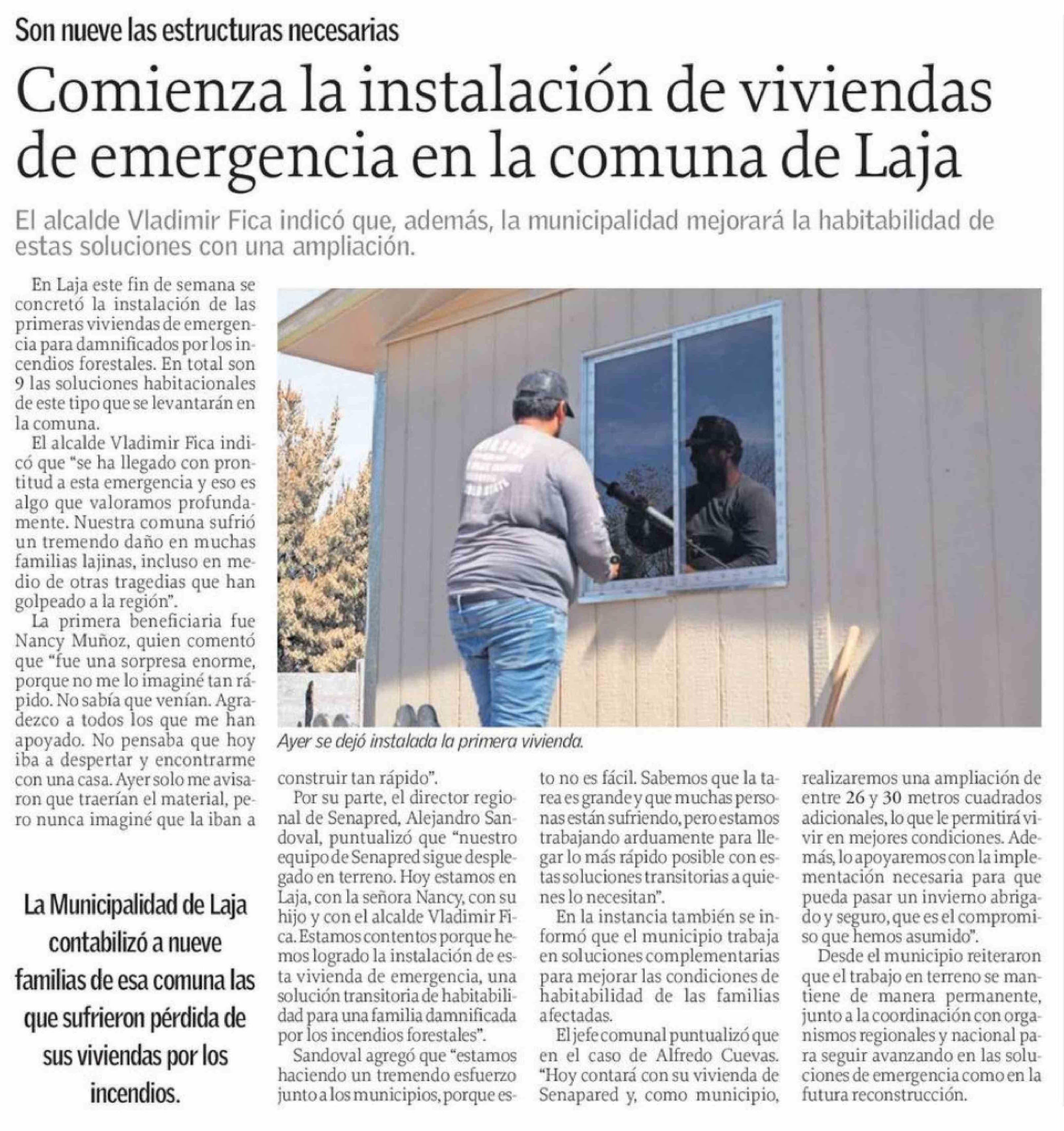 Comienza la instalación de viviendas de emergencia en la comuna de Laja