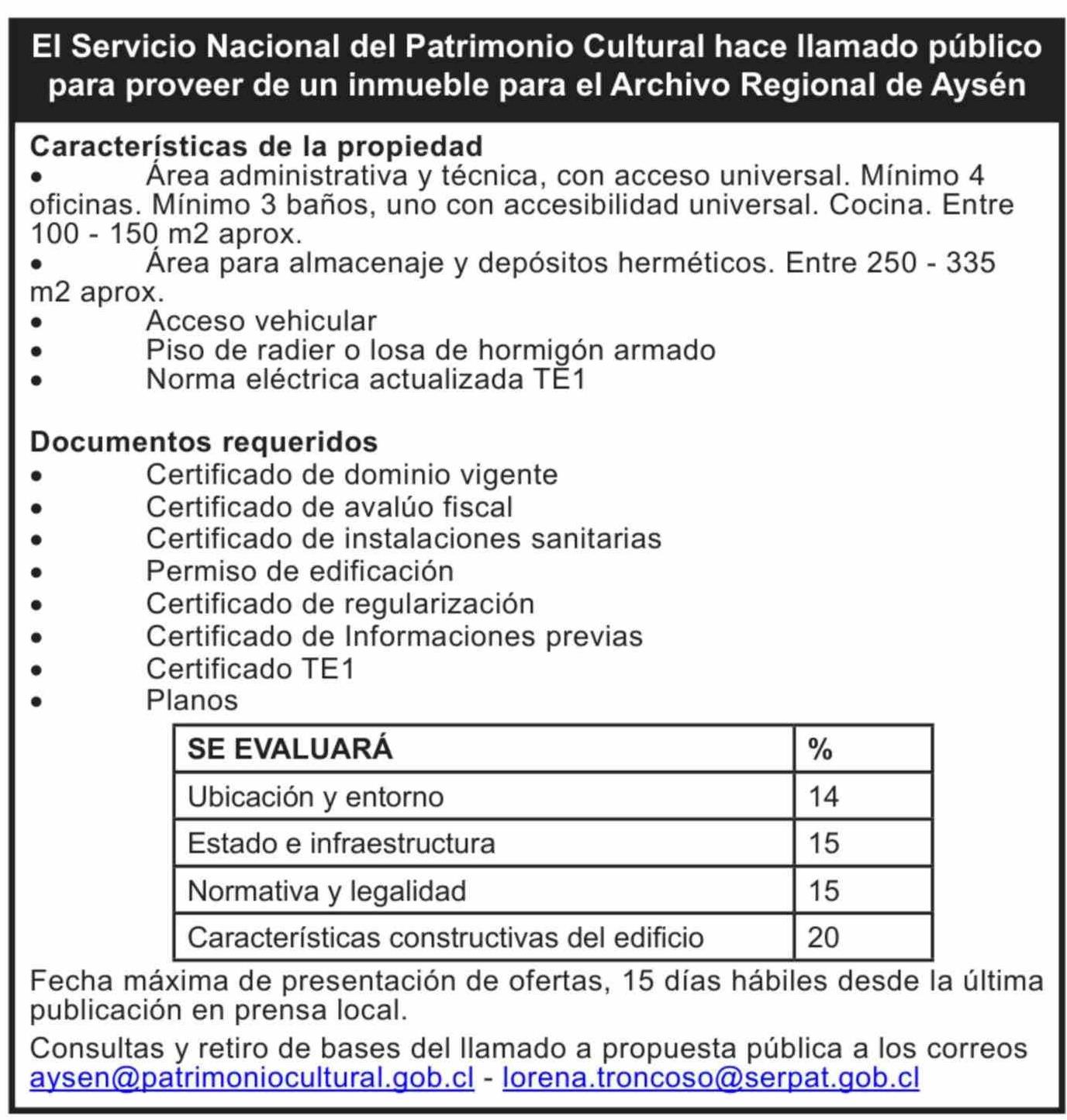 | Título: | Remates: El Servicio Nacional del Patrimonio Cultural hace llamado público para proveer de un inmueble para el Archivo Regional de Aysén Características de la propiedad Área administrativa y tecnica, con acceso universal. Mínimo 4 . oficinas. Mínimo 3 baños, uno con accesibilidad universal. Cocina. |