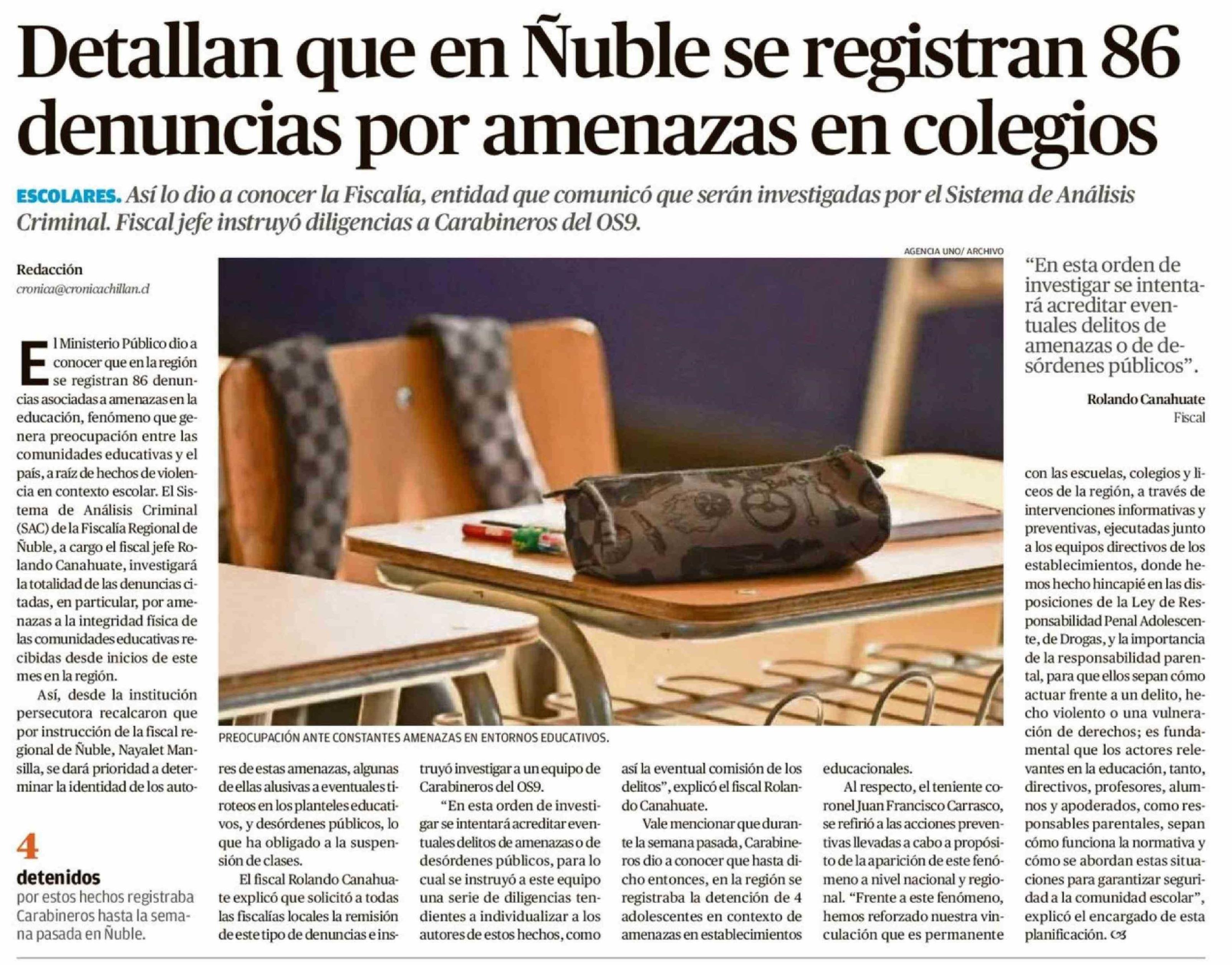 Detallan que en Ñuble se registran 86 denuncias por amenazas en colegios