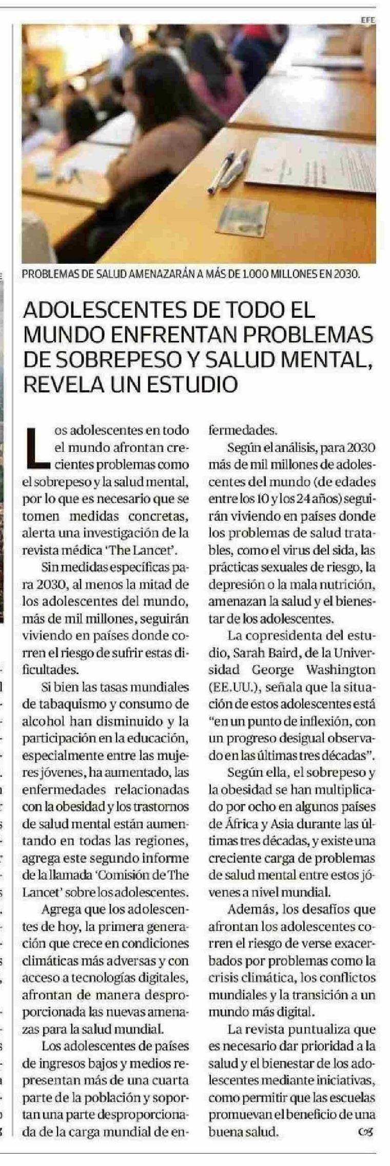ADOLESCENTES DE TODO EL MUNDO ENFRENTAN PROBLEMAS DE SOBREPESO Y SALUD MENTAL, REVELA UN ESTUDIO