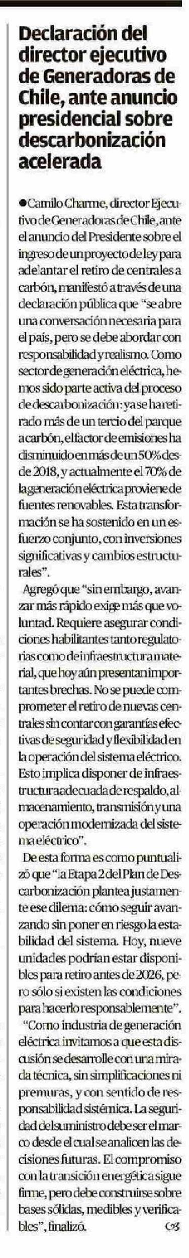 Declaración del rector ejecutivo de Generadoras de Chile, ante anuncio presidencial sobre descarbonización acelerada