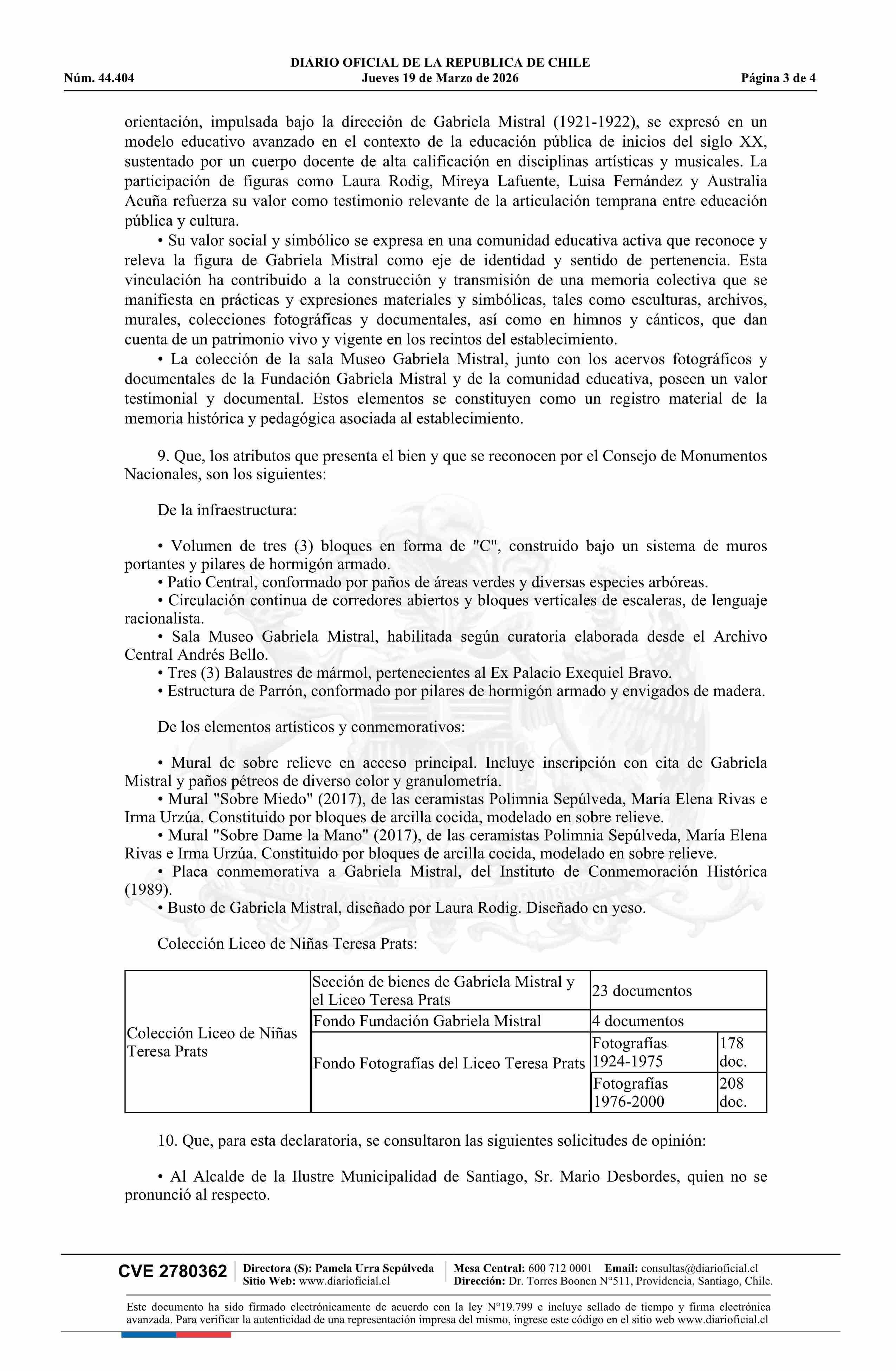 Título: Decreto exento número 34, de 2026.- Declara Monumento Nacional, en la Categoría de Monumento Histórico, el Liceo de Niñas Nº 6, Teresa Prats, comuna de Santiago, Región Metropolitana de Santiago