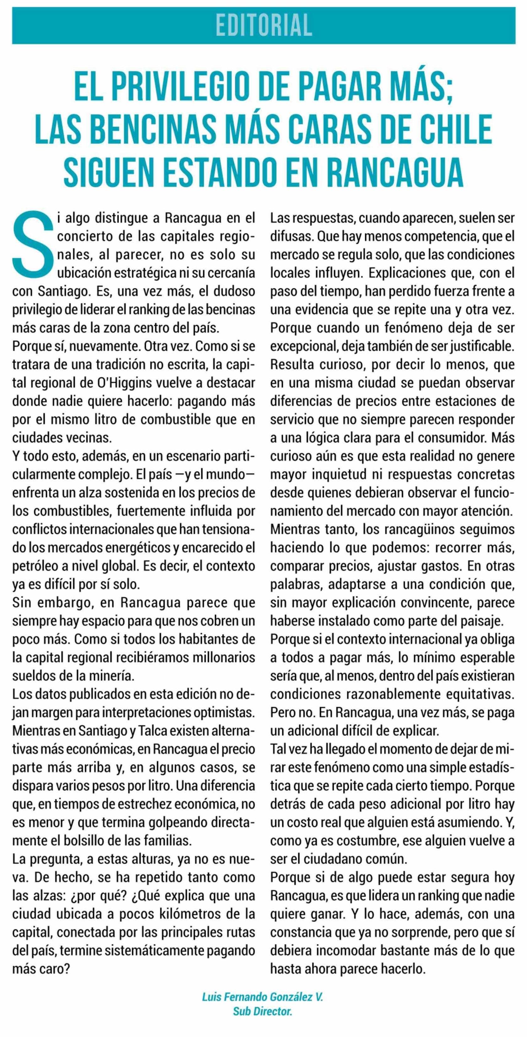 Editorial: EL PRIVILEGIO DE PAGAR MÁS; LAS BENCINAS MÁS CARAS DE CHILE SIGUEN ESTANDO EN RANCAGUA