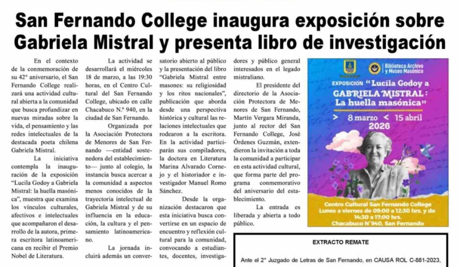 San Fernando College inaugura exposición sobre Gabriela Mistral y presenta libro de investigación