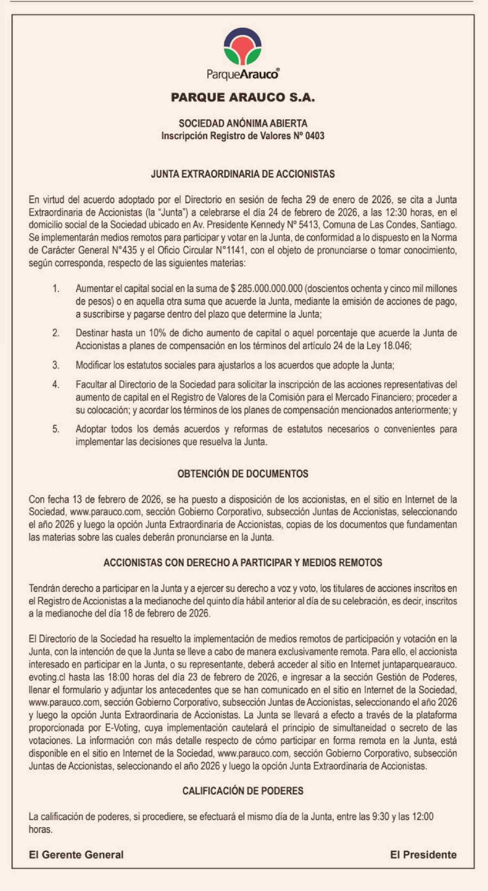 Extractos: PARQUE ARAUCO S.A.