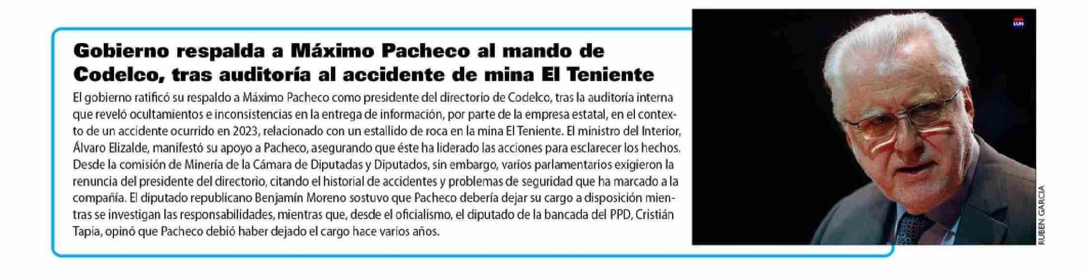 Gobierno r ida a Máxi Pach al do de Codelco, tras auditoría al accidente de mina El Teniente