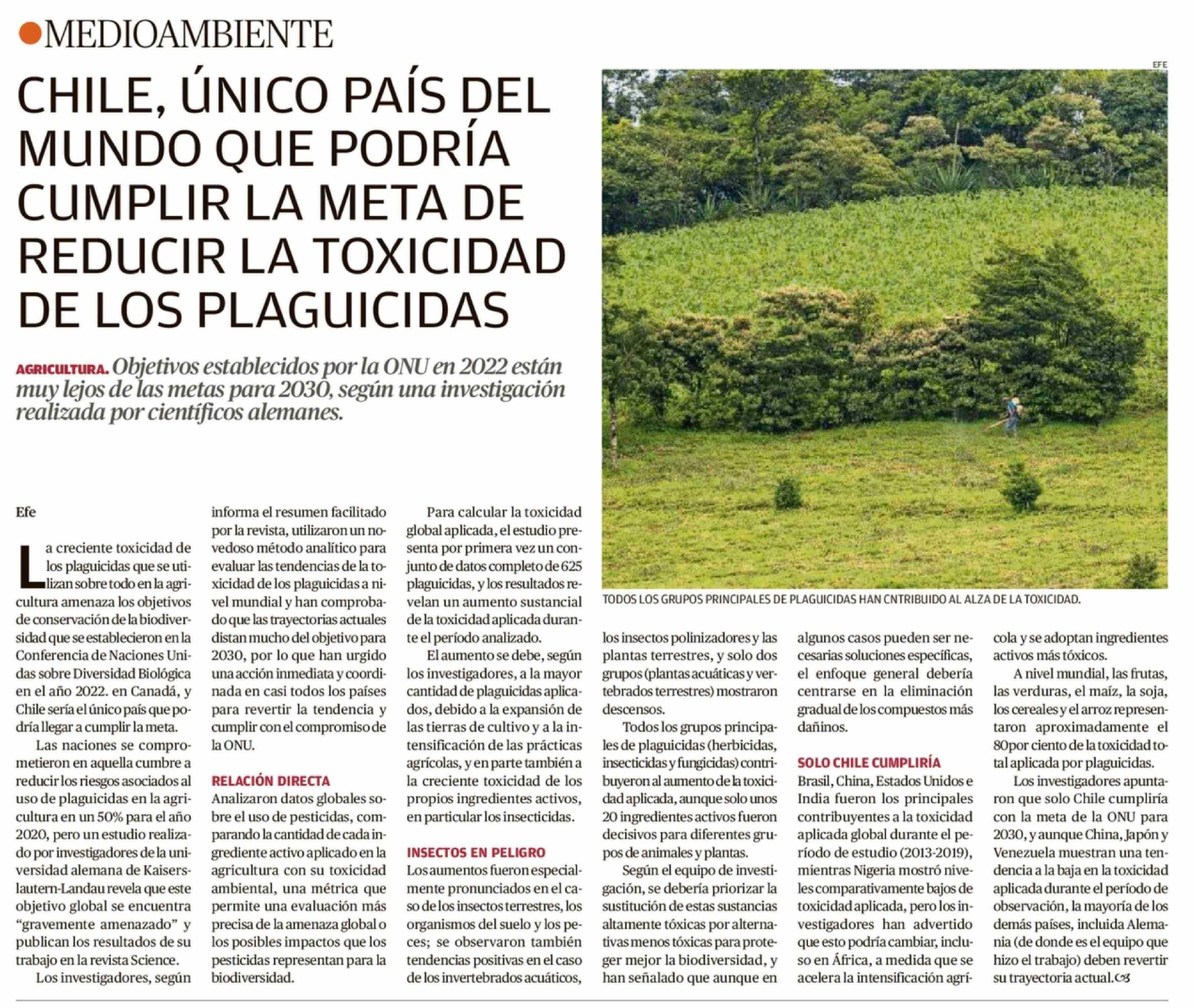 CHILE, ÚNICO PAÍS DEL MUNDO QUE PODRÍA CUMPLIR LA META DE REDUCIR LA TOXICIDAD DE LOS PLAGUICIDAS