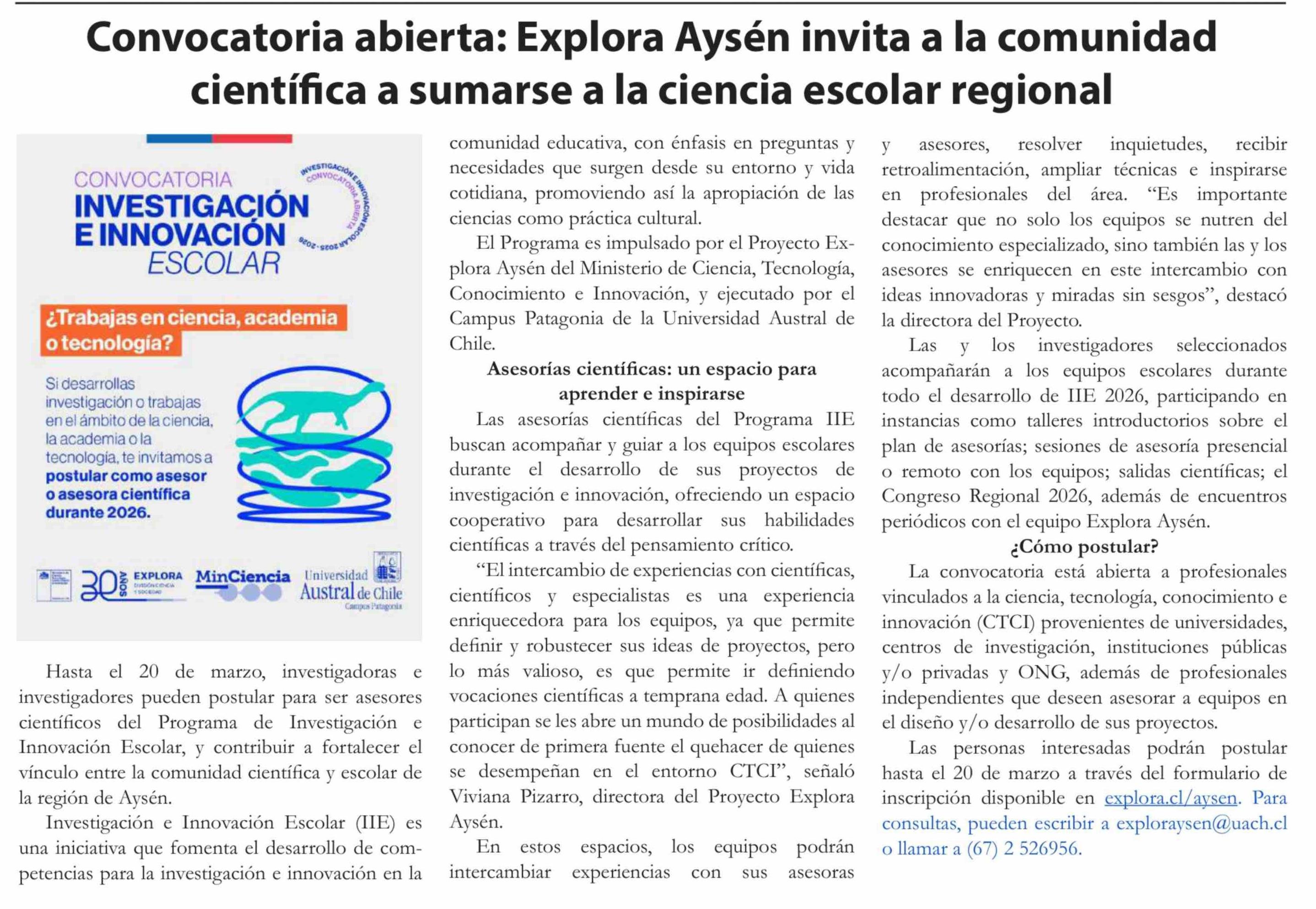 Convocatoria abierta: Explora Aysén invita a la comunidad científica a sumarse a la ciencia escolar regional