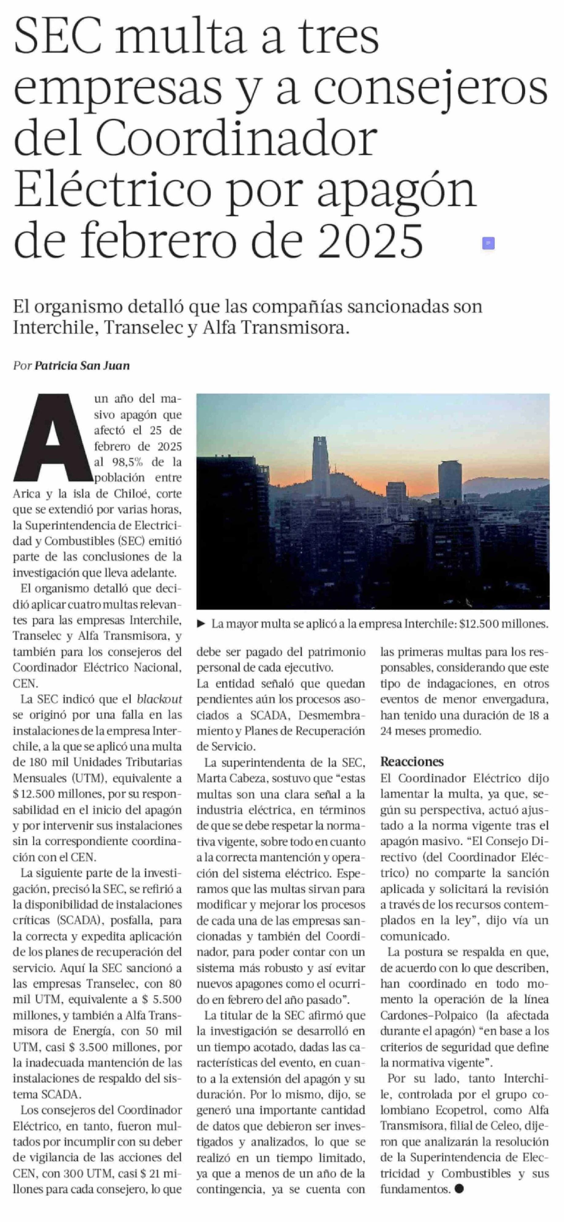 SEC multa a tres empresas y a consejeros del Coordinador Eléctrico por apagón de febrero de 2025