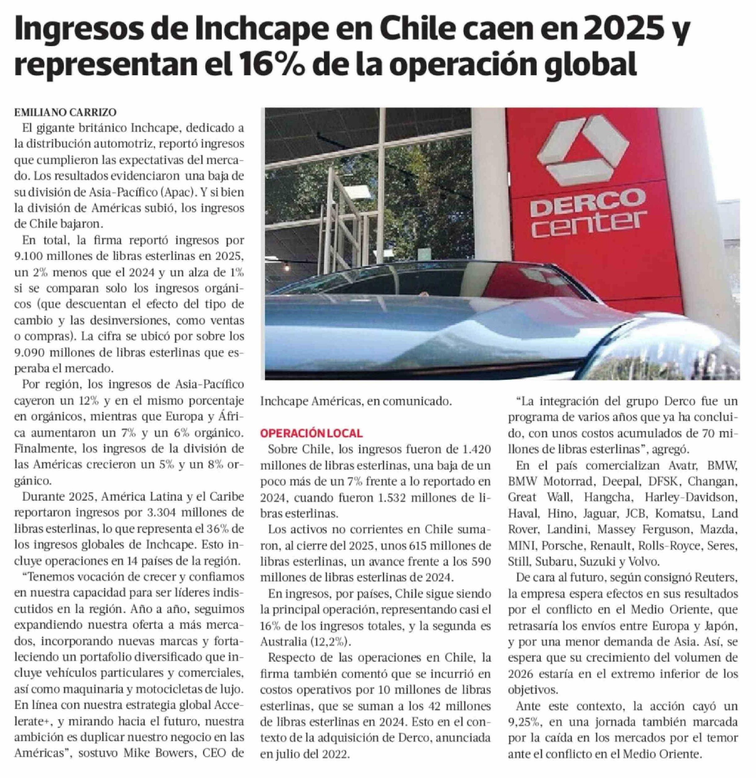 Ingresos de Inchcape en Chile caen en 2025 y representan el 16% de la operación global