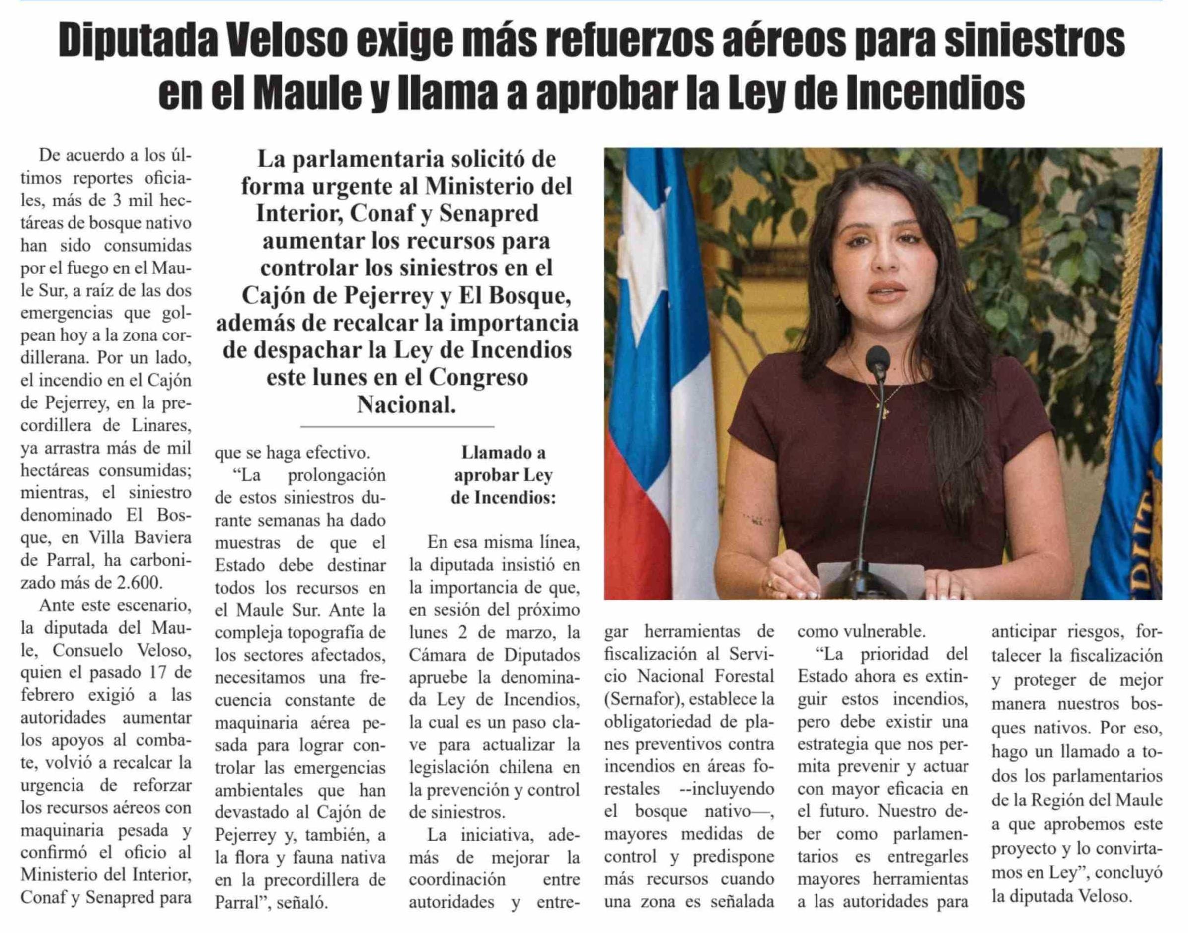 Diputada Veloso exige más refuerzos aéreos para siniestros en el Maule y llama a aprobar la Ley de Incendios