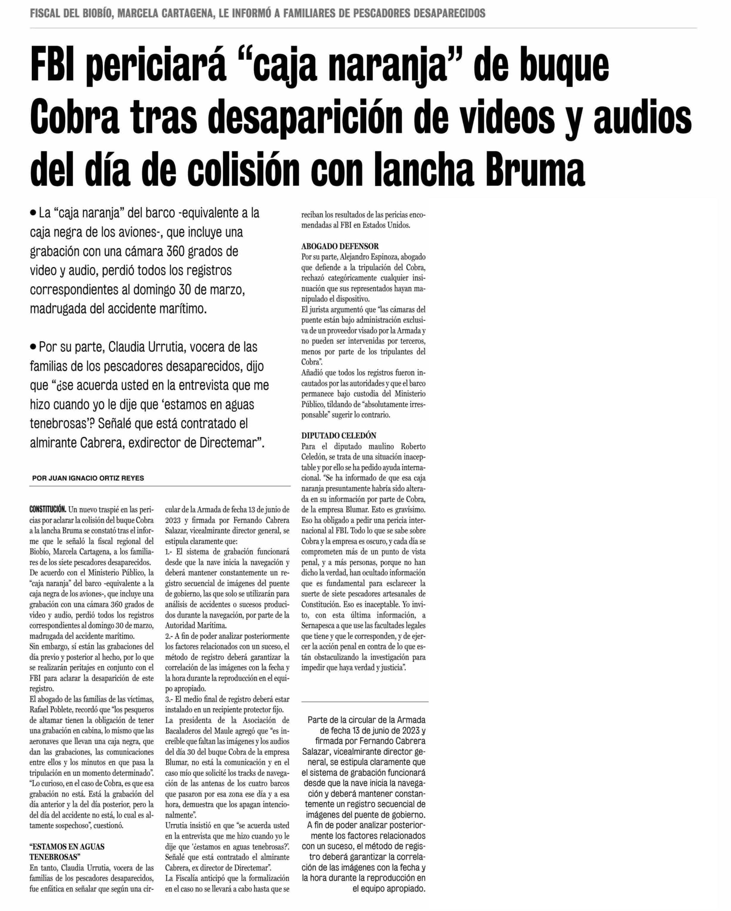 FBI periciará “caja naranja” de buque Cobra tras desaparición de videos y audios del día de colisión con lancha Bruma