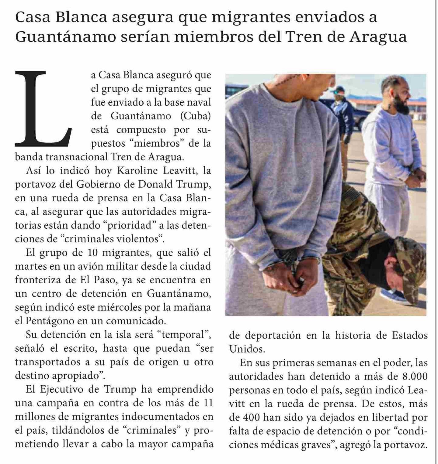 Casa Blanca asegura que migrantes enviados a Guantánamo serían miembros del Tren de Aragua