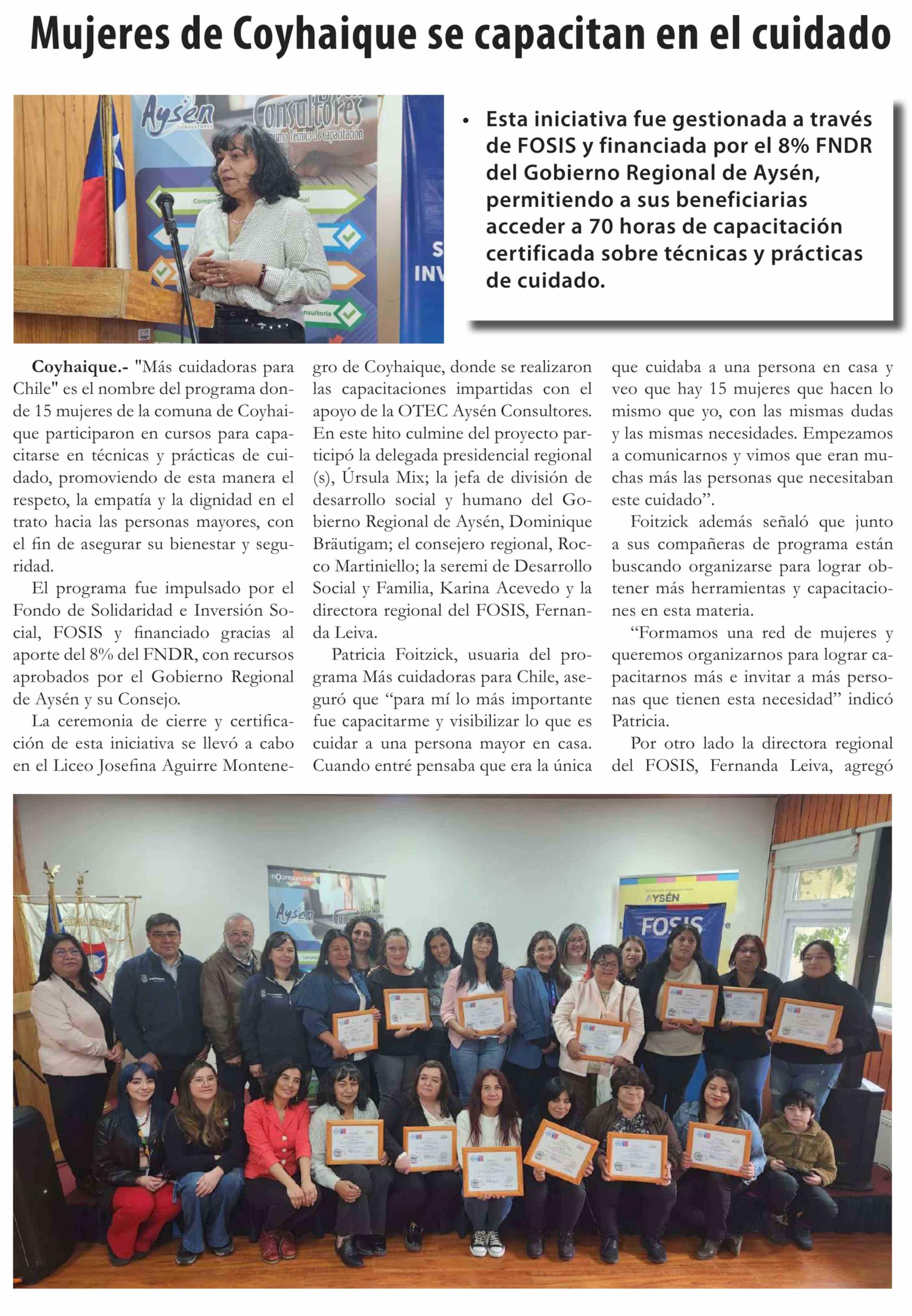 Mujeres de Coyhaique se capacitan en el cuidado
