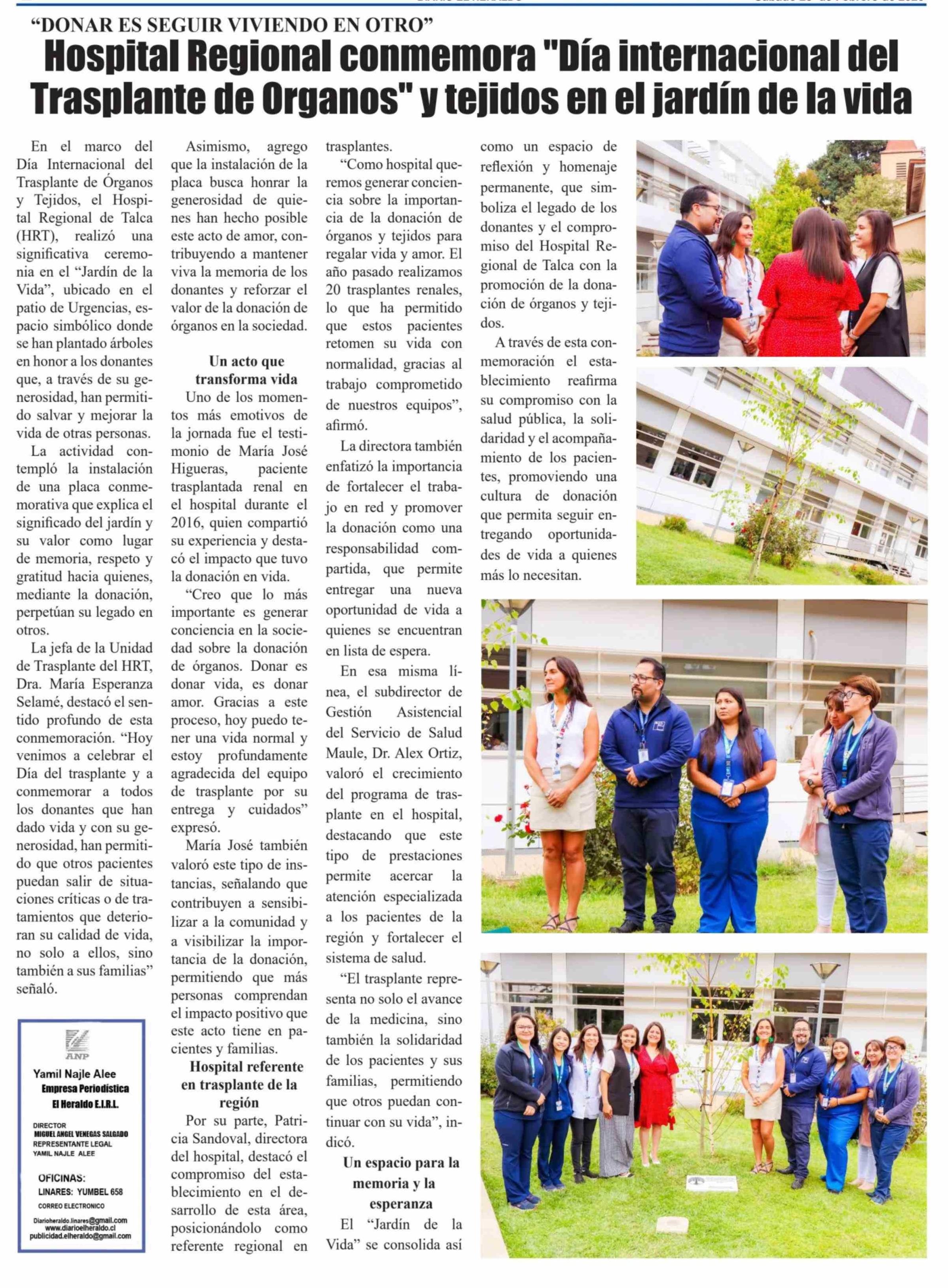 Título: Editorial: Hospital Regional conmemora "Día internacional del Trasplante de Organos" y tejidos en el jardín de la vida