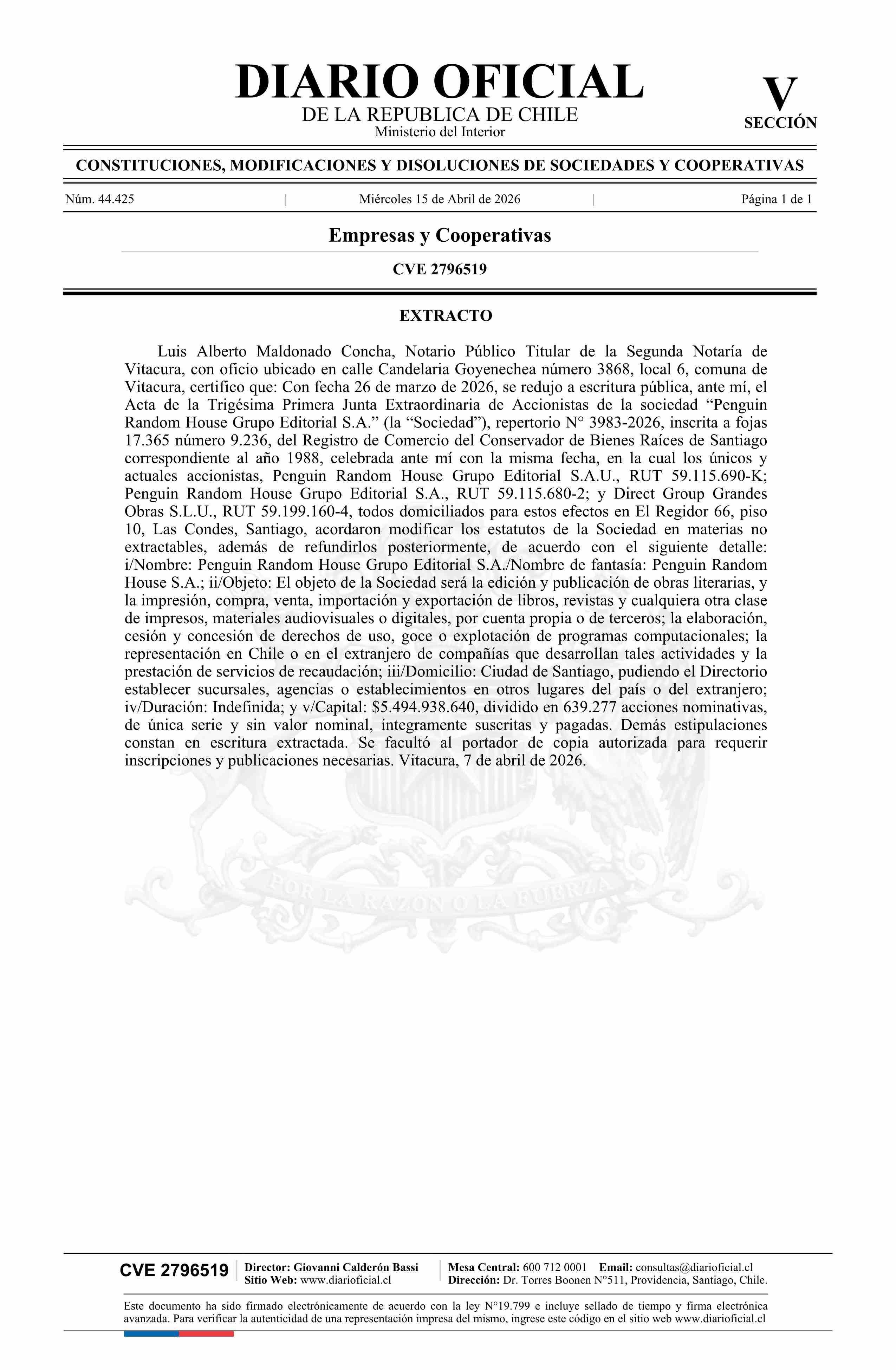 Diario Oficial Edición Electrónica (Diario Oficial de Chile - 5 Empresas Y Cooper)