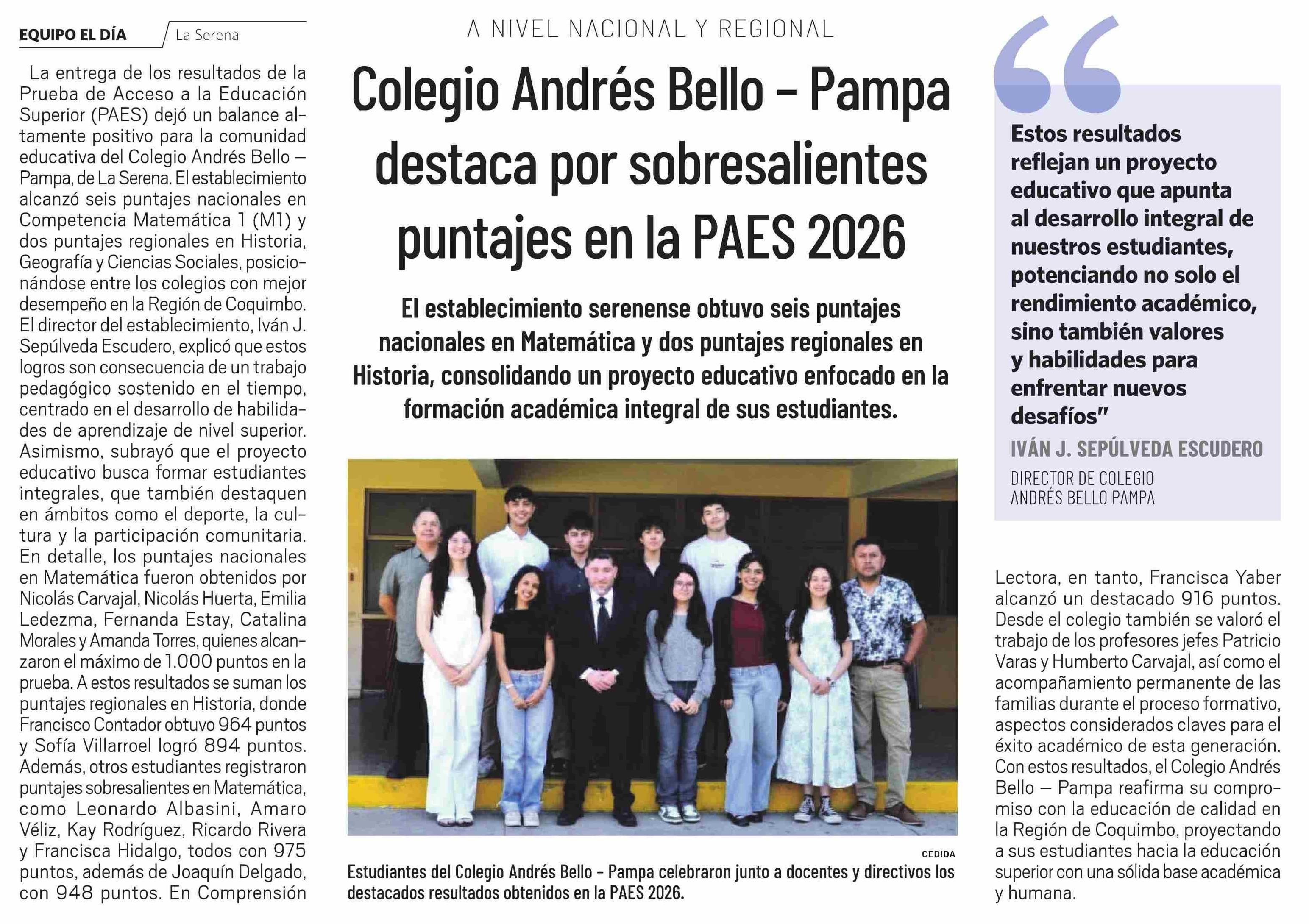 Colegio Andrés Bello - Pampa destaca por sobresalientes puntajes en la PAES 2026