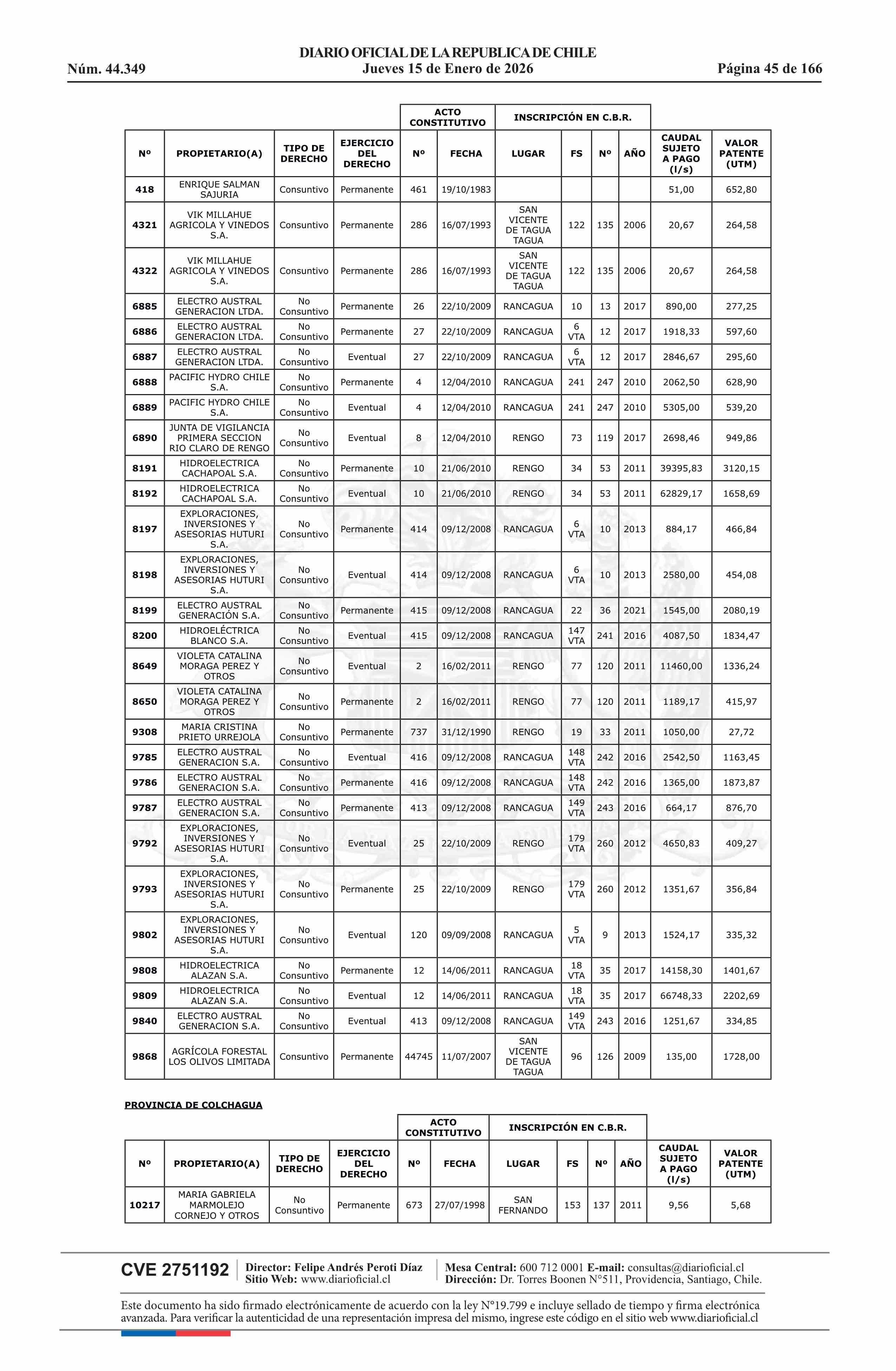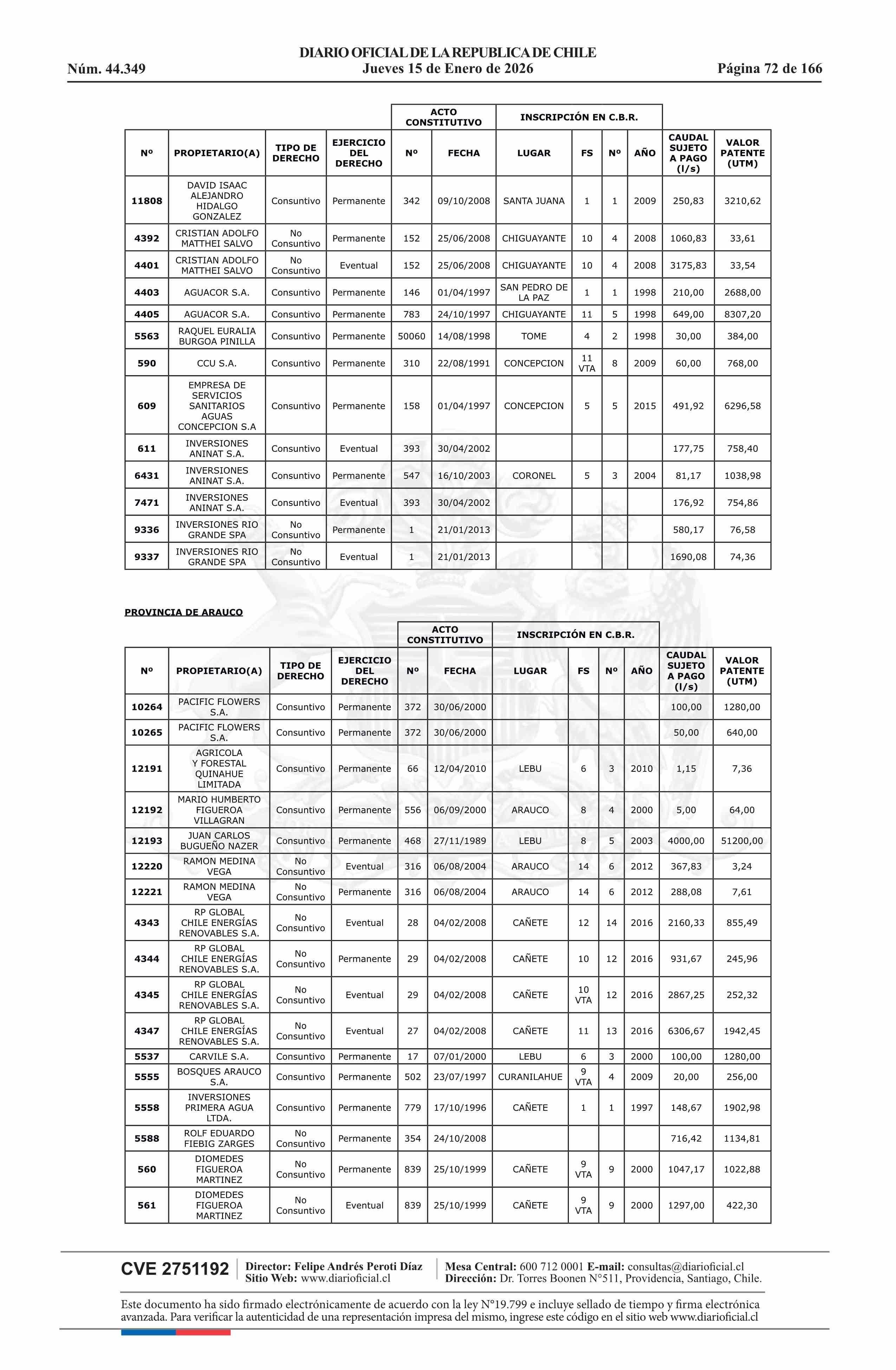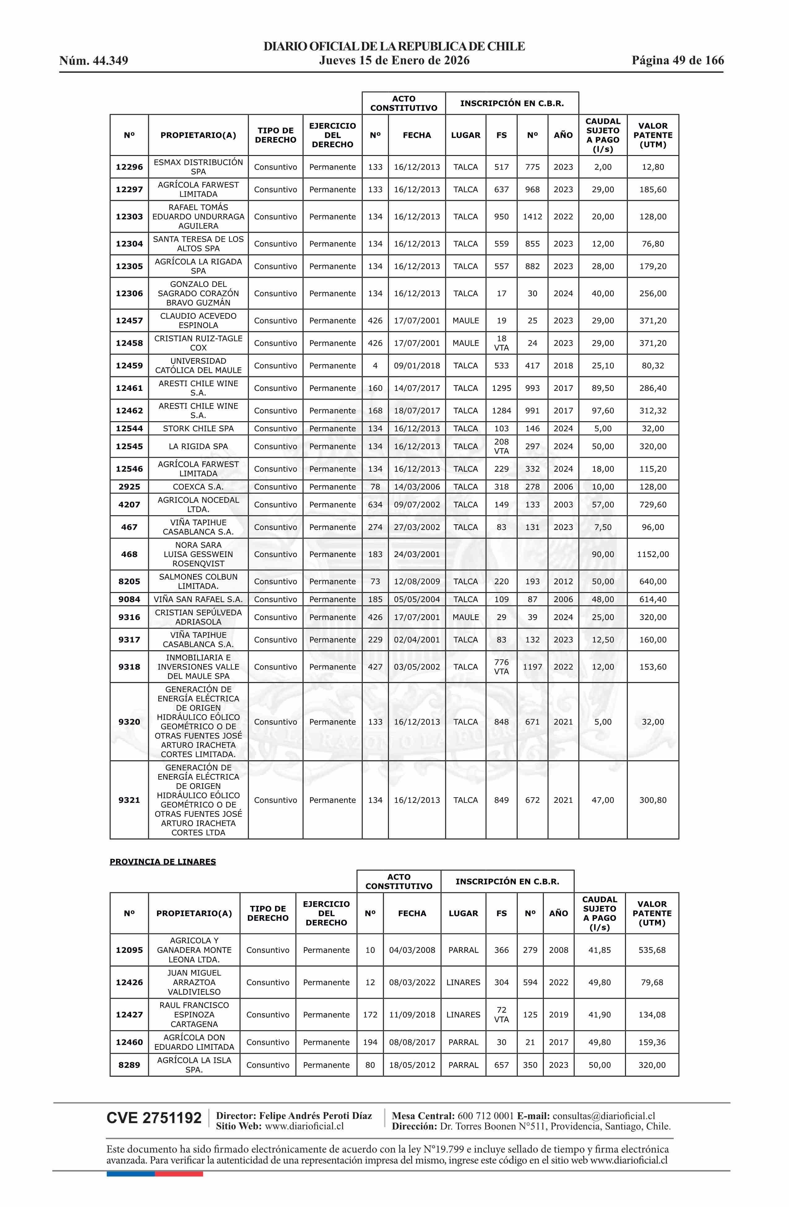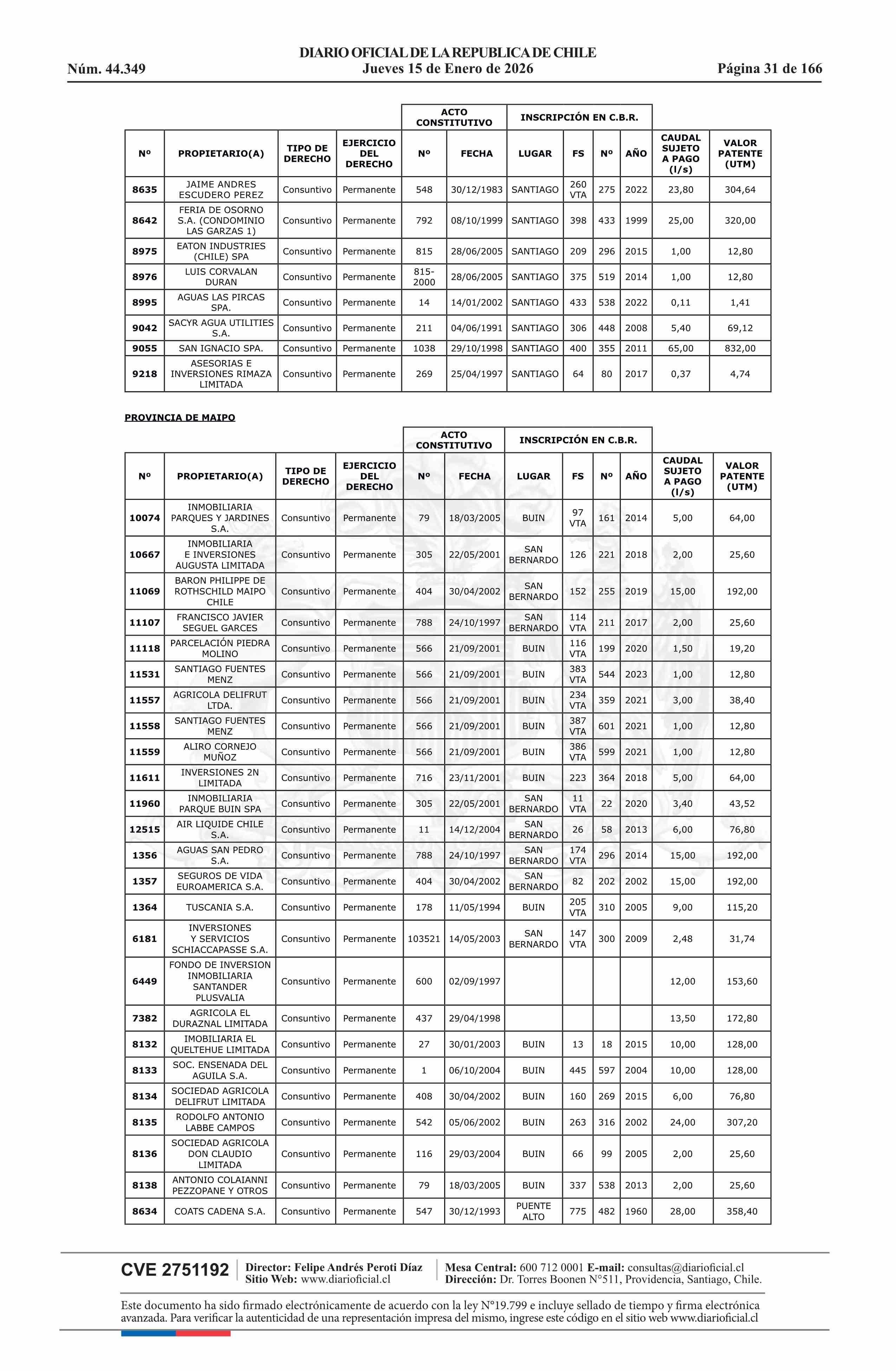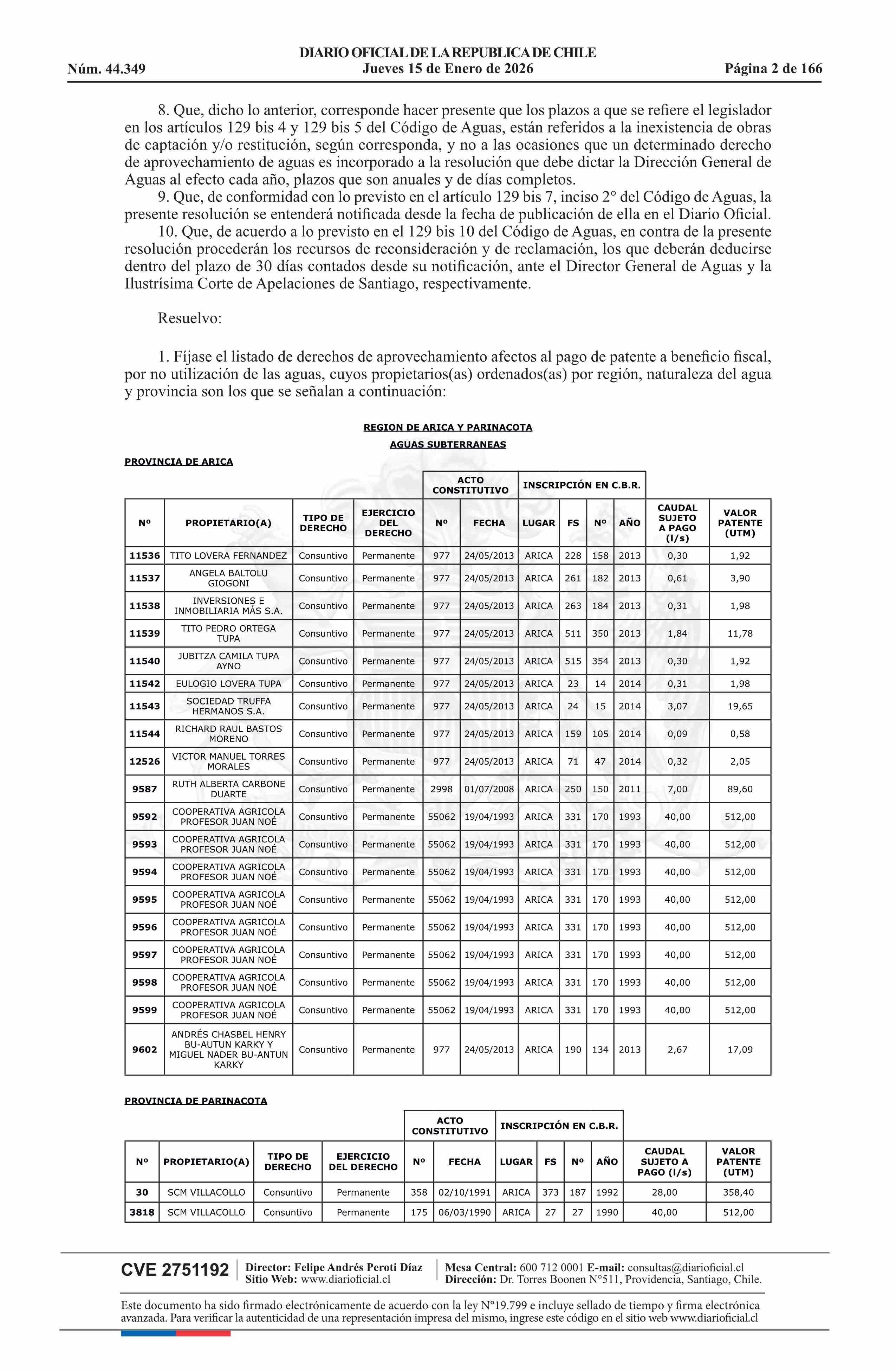 Título: Resolución exenta número 5.357, de 2025.- Fija listado de derechos de aprovechamiento de aguas afectos al pago de patente a beneficio fiscal por no utilización de las aguas, proceso 2026