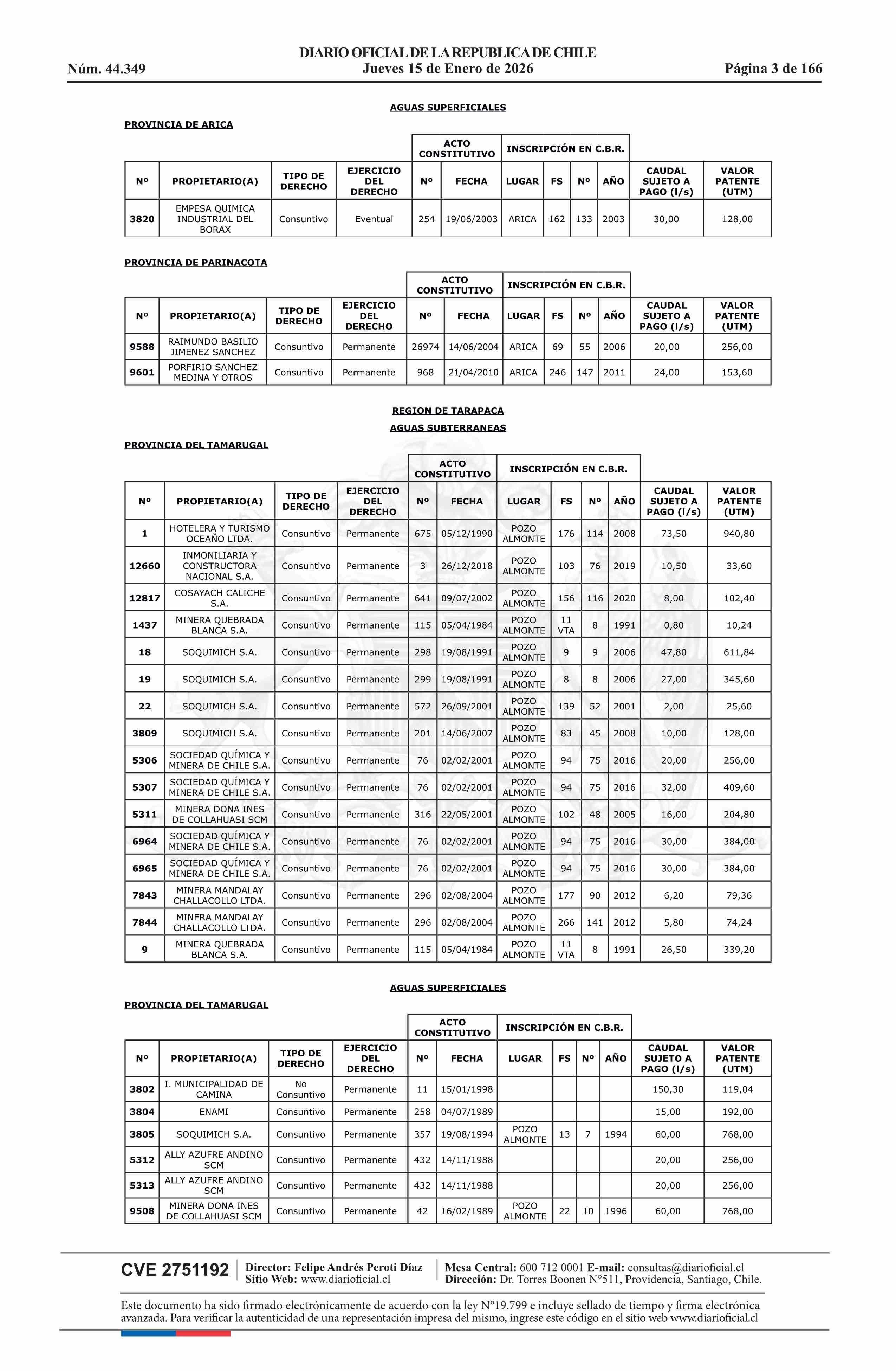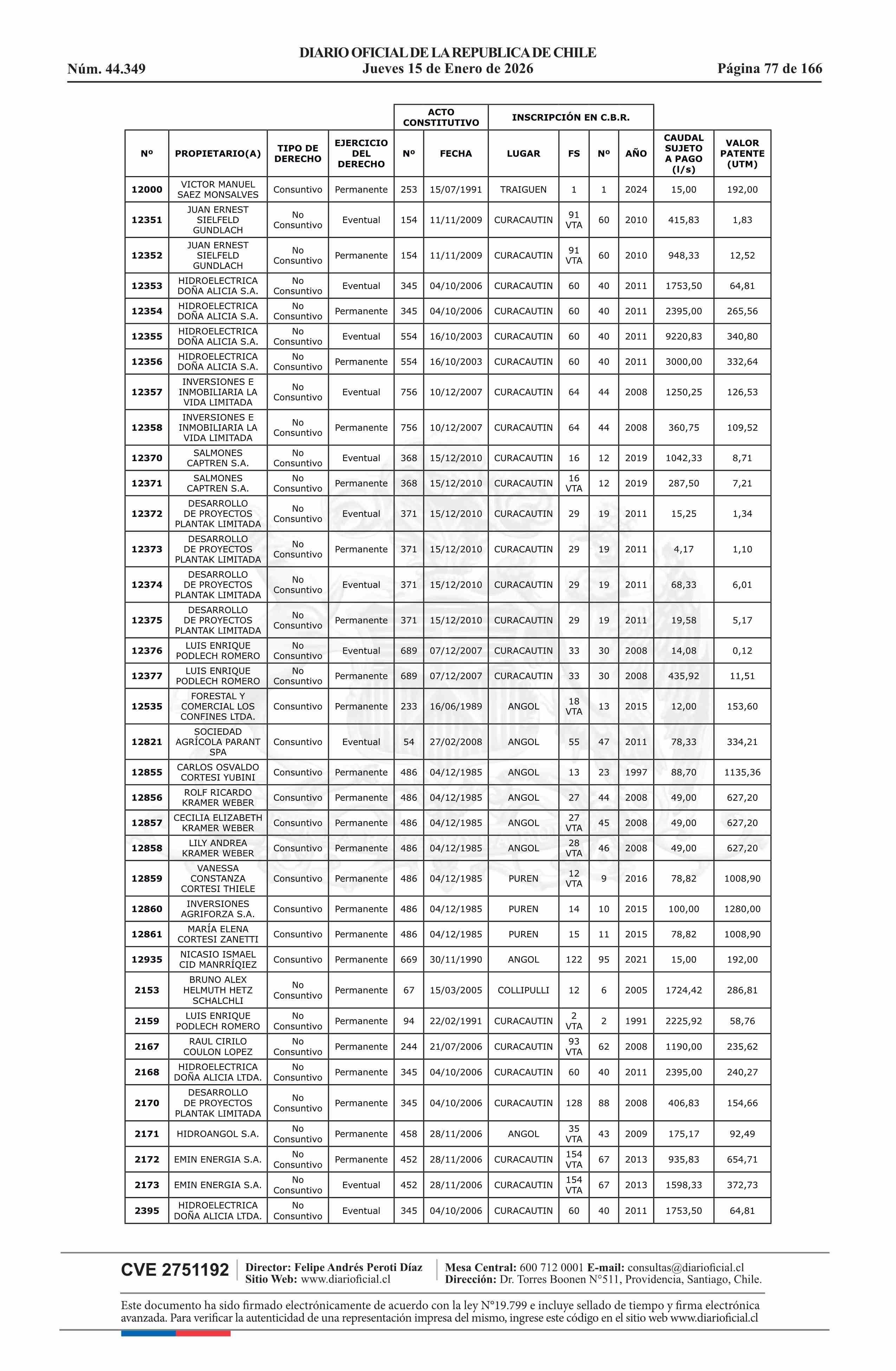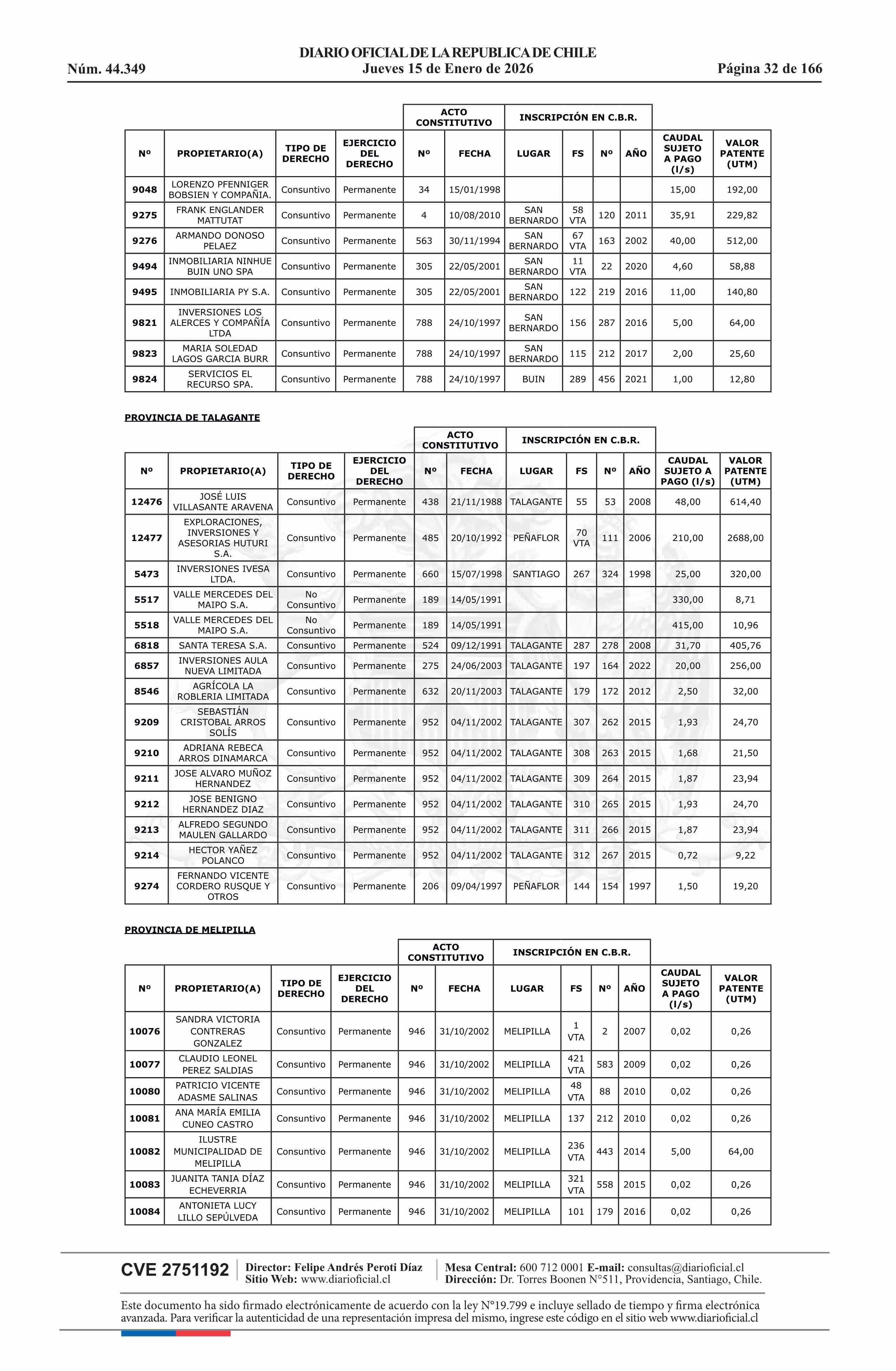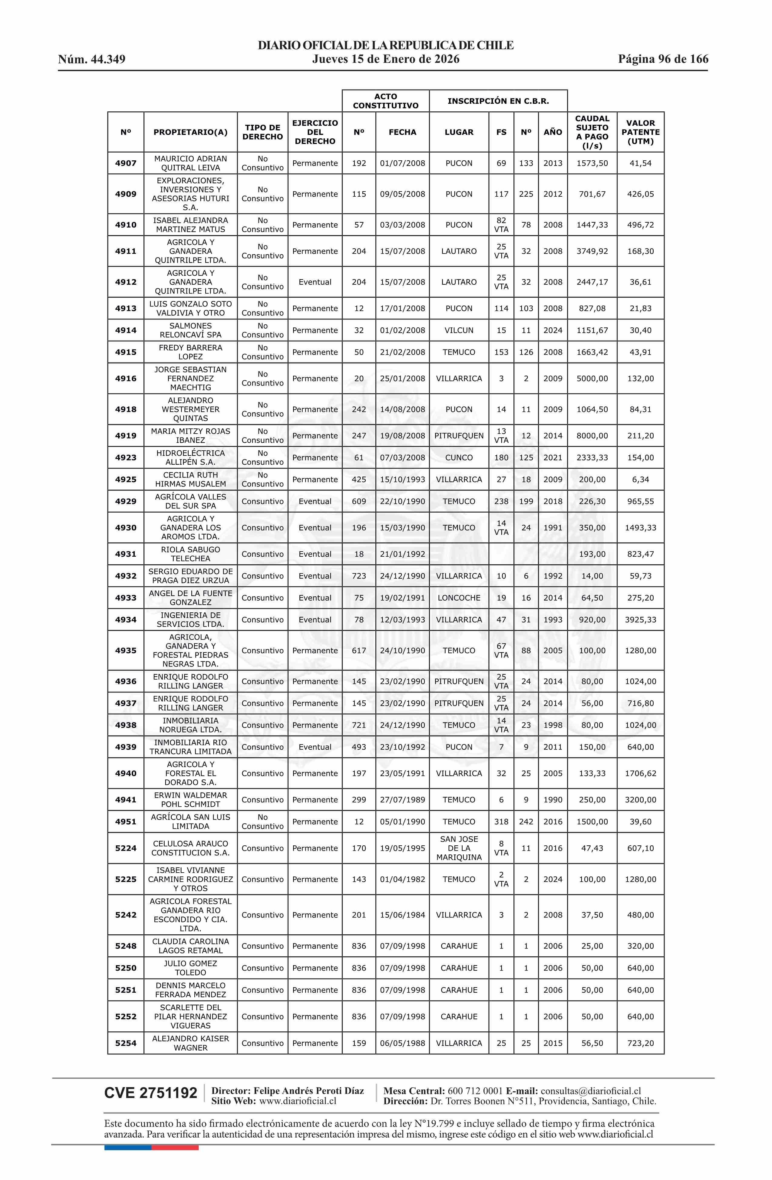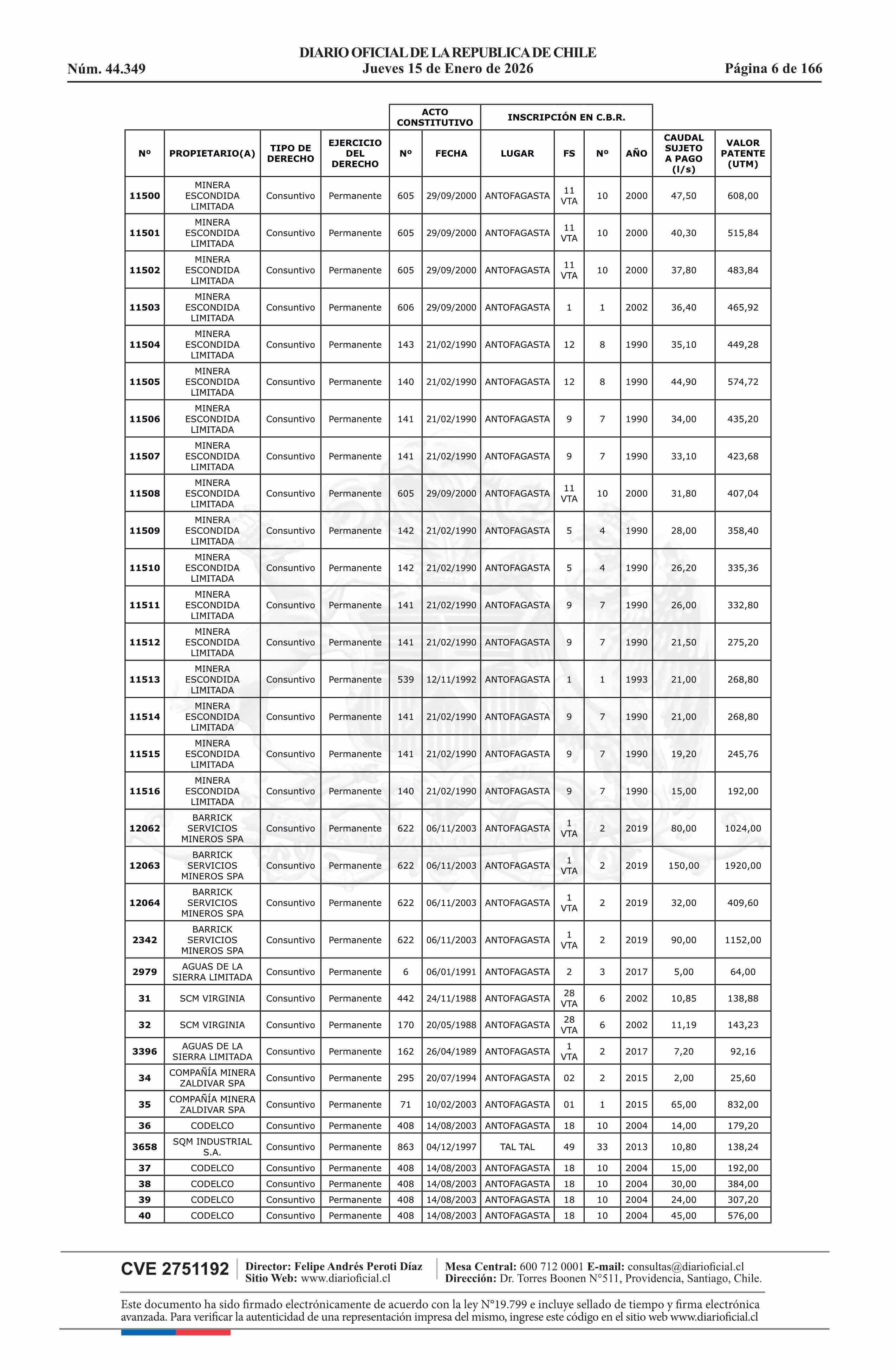 Título: Resolución exenta número 5.357, de 2025.- Fija listado de derechos de aprovechamiento de aguas afectos al pago de patente a beneficio fiscal por no utilización de las aguas, proceso 2026